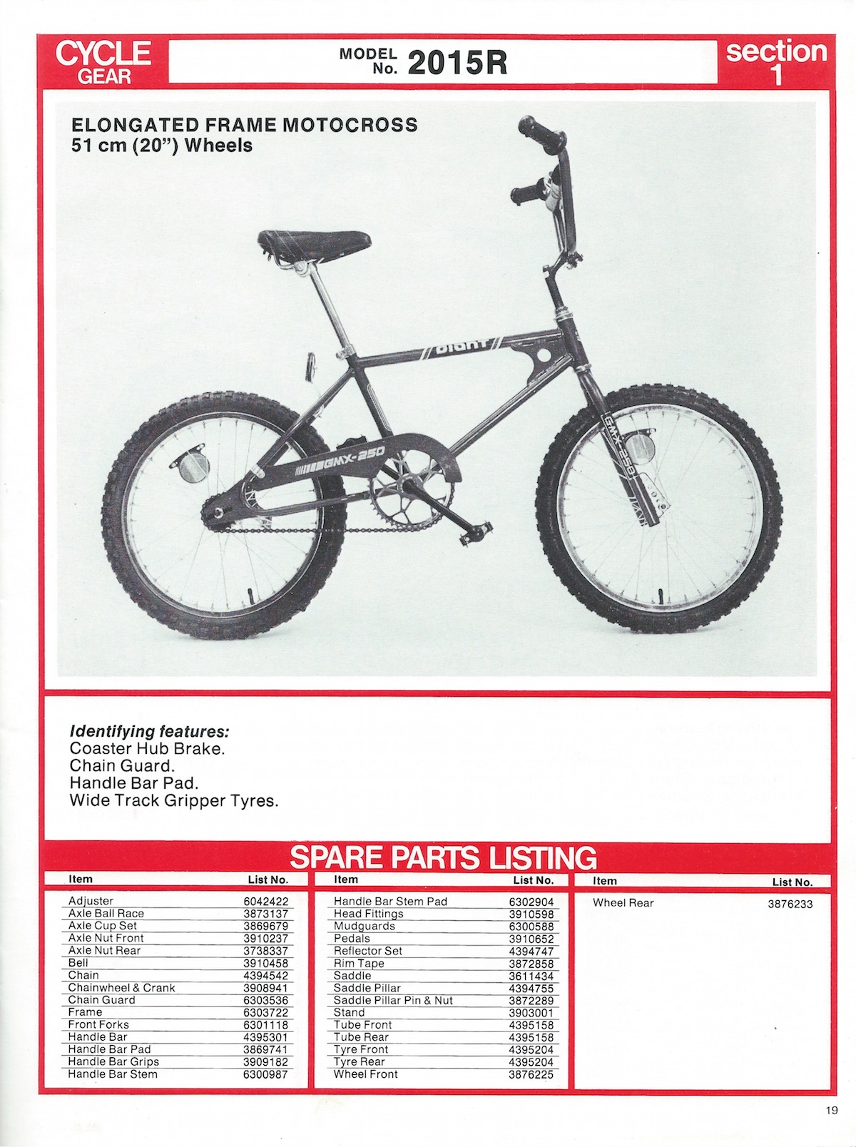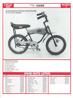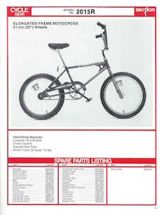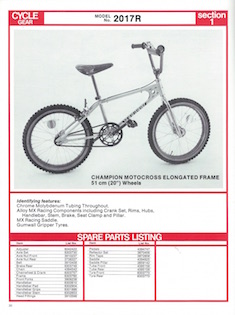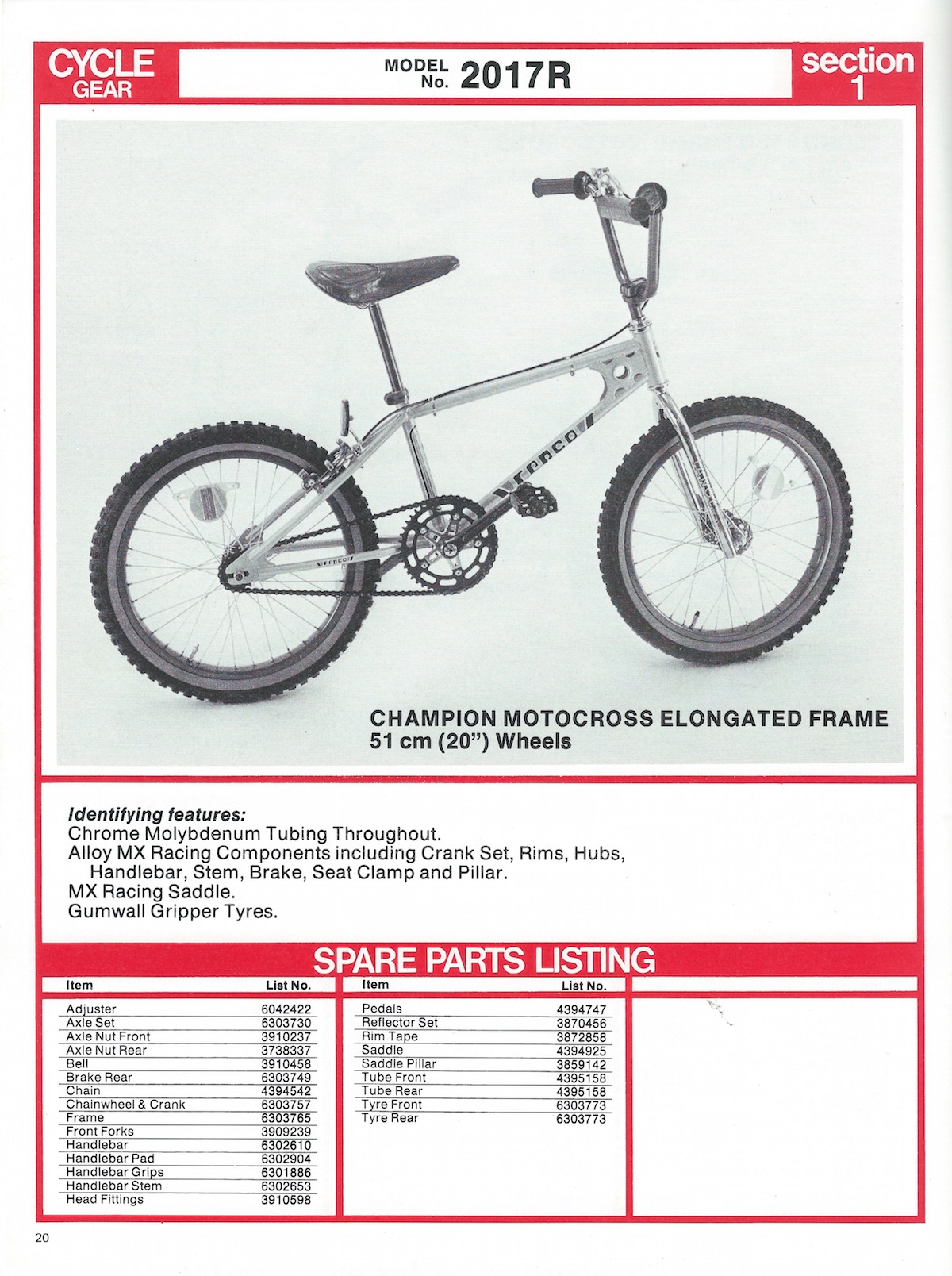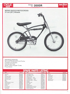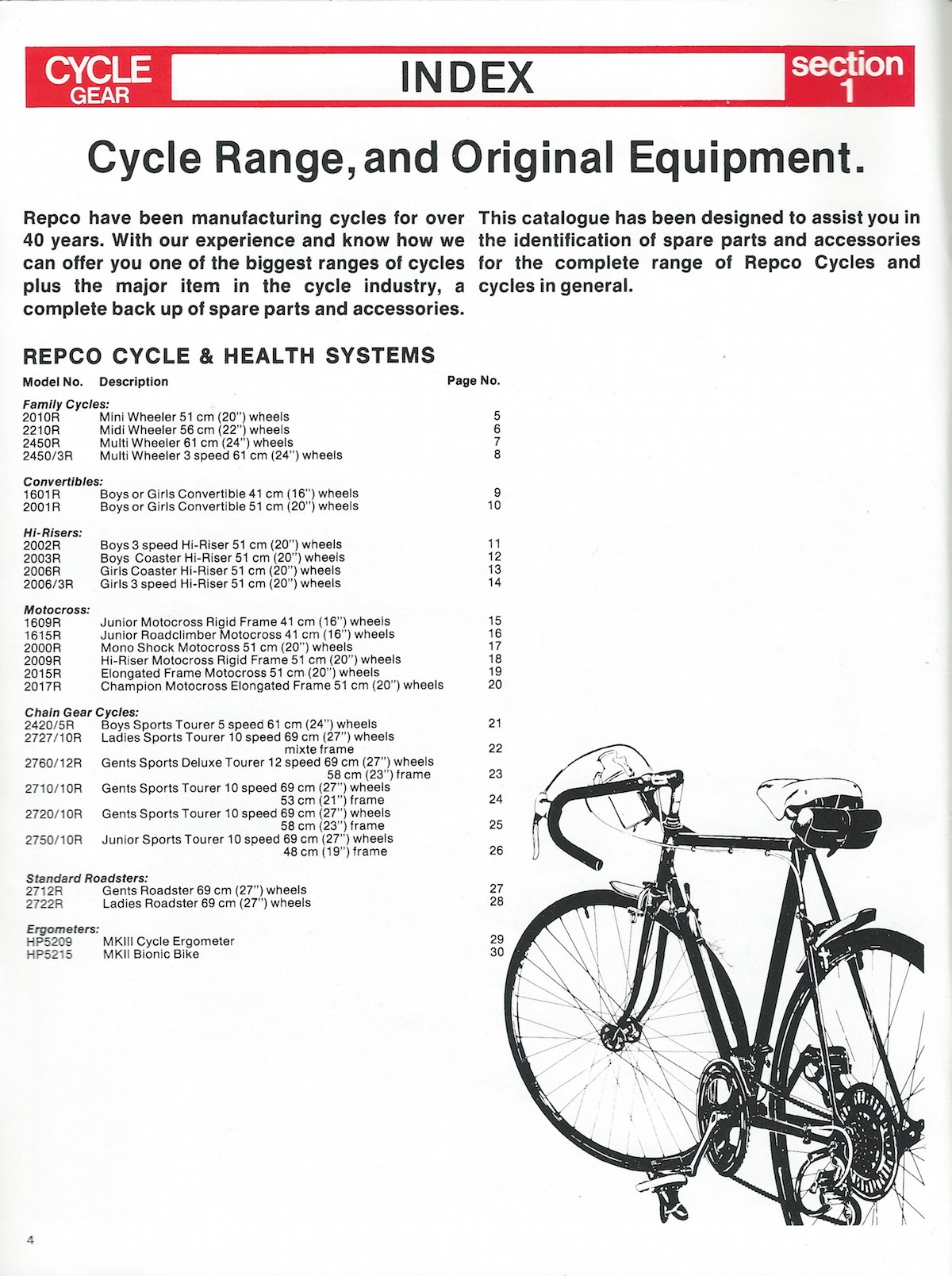 The '80 Repco Catalogue looks more like a spare parts catalogue you would find in one of the Repco car part dealers than the glossy sales brochures seen in later years. The front section consists of a roll call of bicycles ranging from adults road bikes through to 20" and 16" children's bikes. Each page features a 'mug shot' of the bicycle along with list of identifying features and replacement part code and descriptions. The highlights of this catalog include the Giant GMX-250, the predecessor to the Team Hotfoot - known as the 2017R - and the motocross range of rigid and mono shock frames.