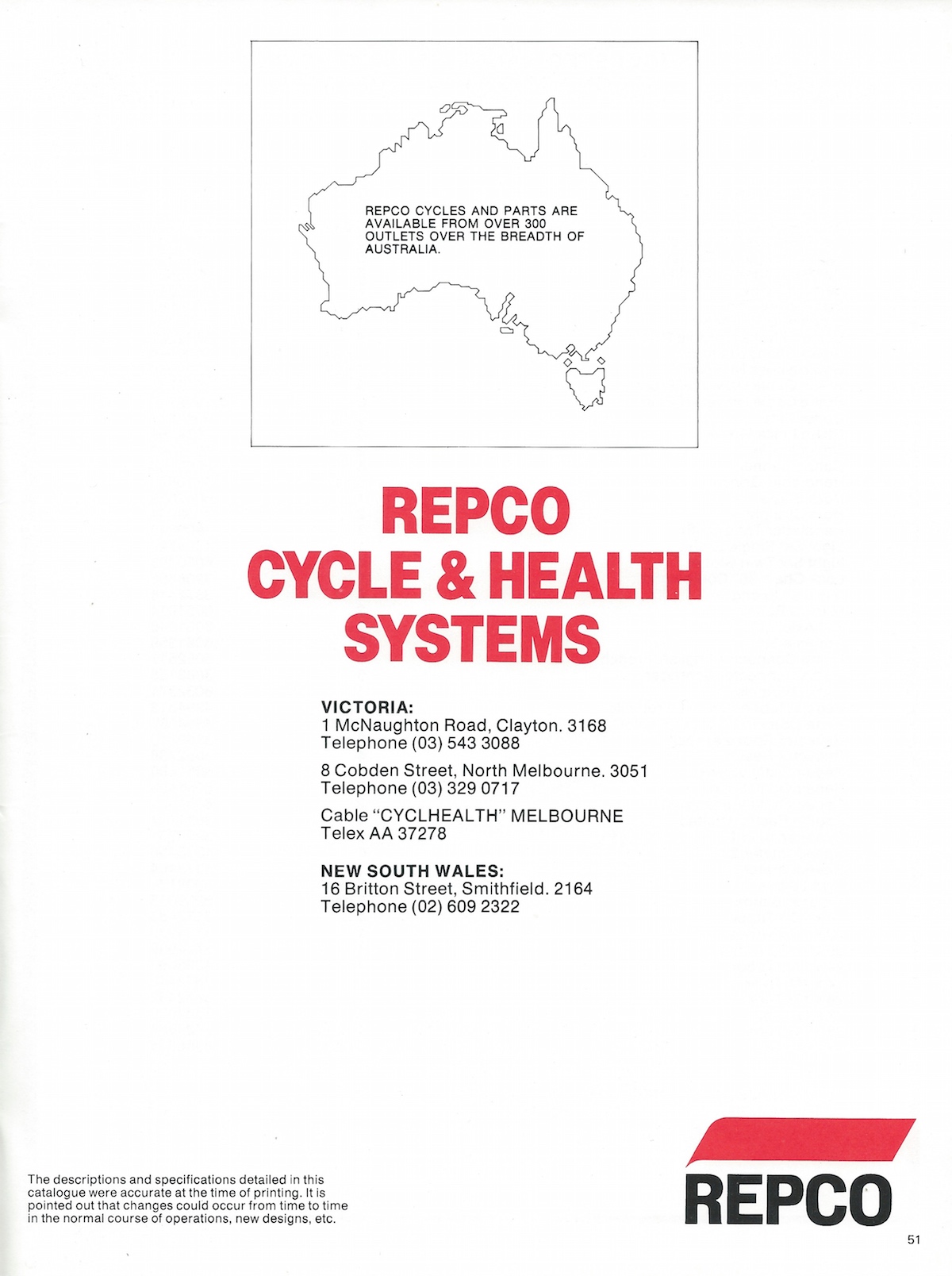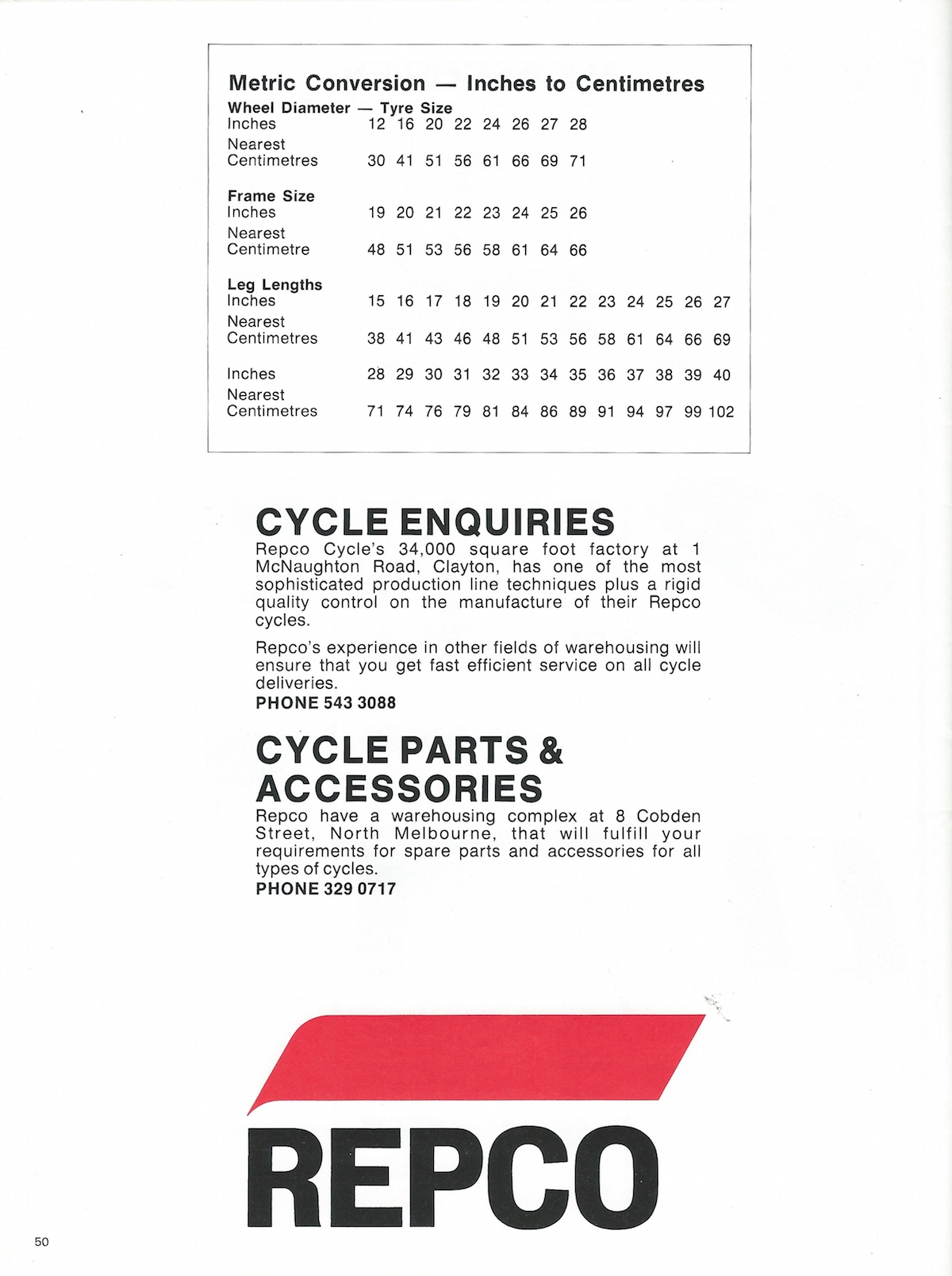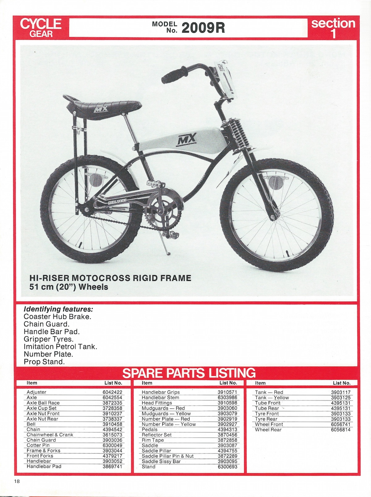 The '80 Repco Catalogue looks more like a spare parts catalogue you would find in one of the Repco car part dealers than the glossy sales brochures seen in later years. The front section consists of a roll call of bicycles ranging from adults road bikes through to 20" and 16" children's bikes. Each page features a 'mug shot' of the bicycle along with list of identifying features and replacement part code and descriptions. The highlights of this catalog include the Giant GMX-250, the predecessor to the Team Hotfoot - known as the 2017R - and the motocross range of rigid and mono shock frames.