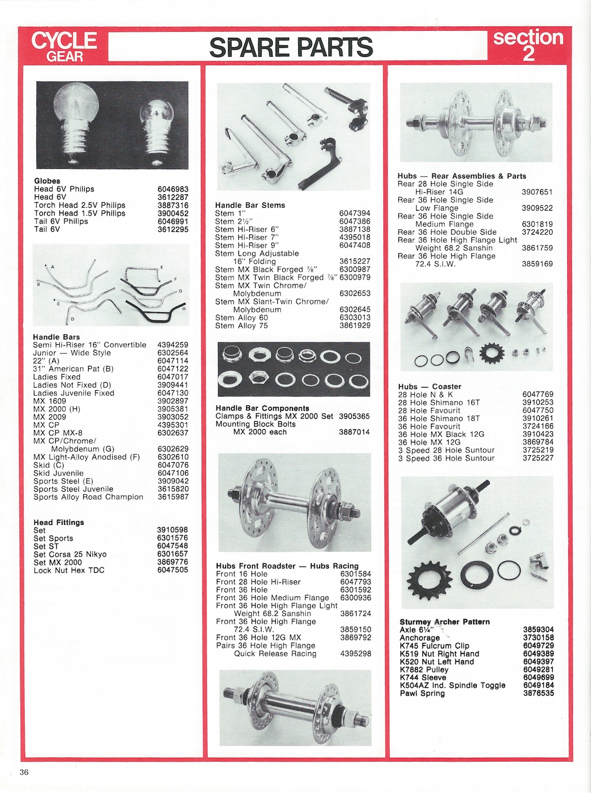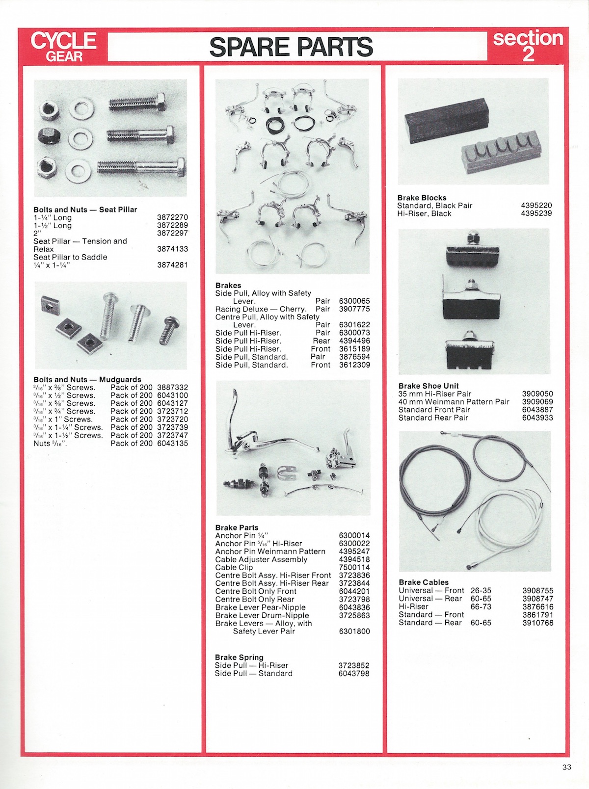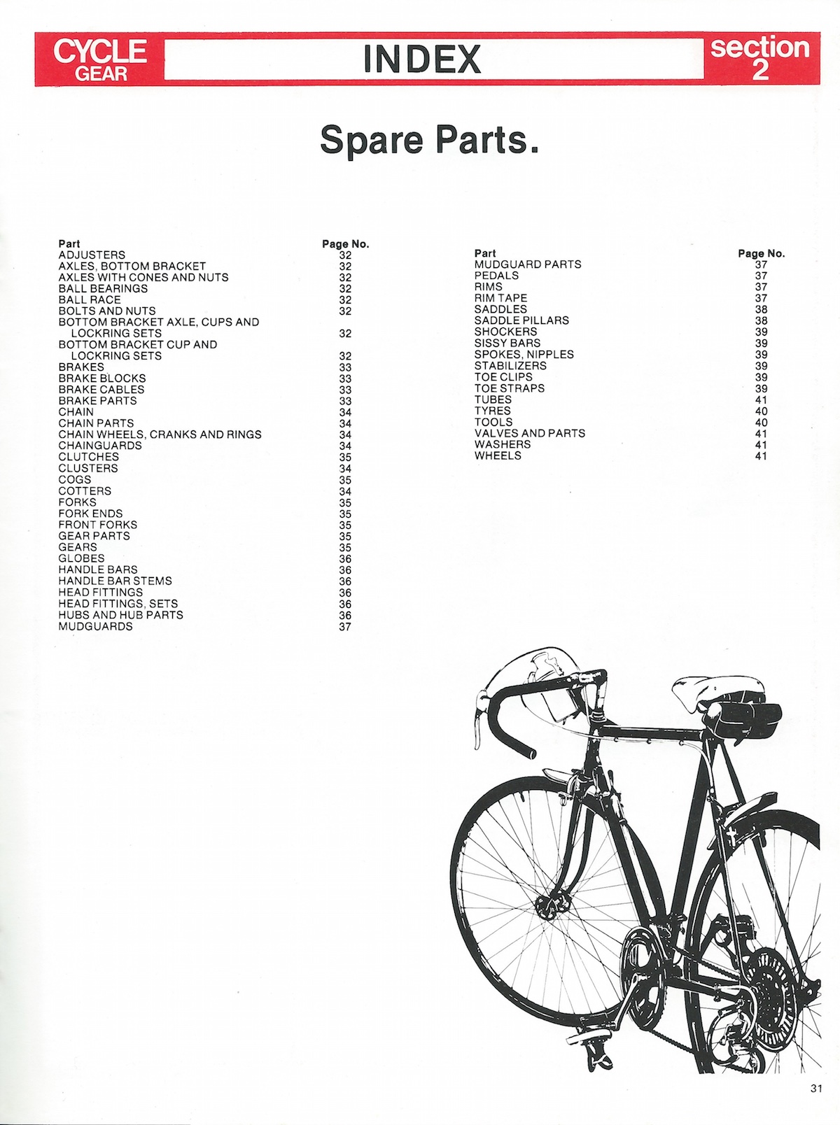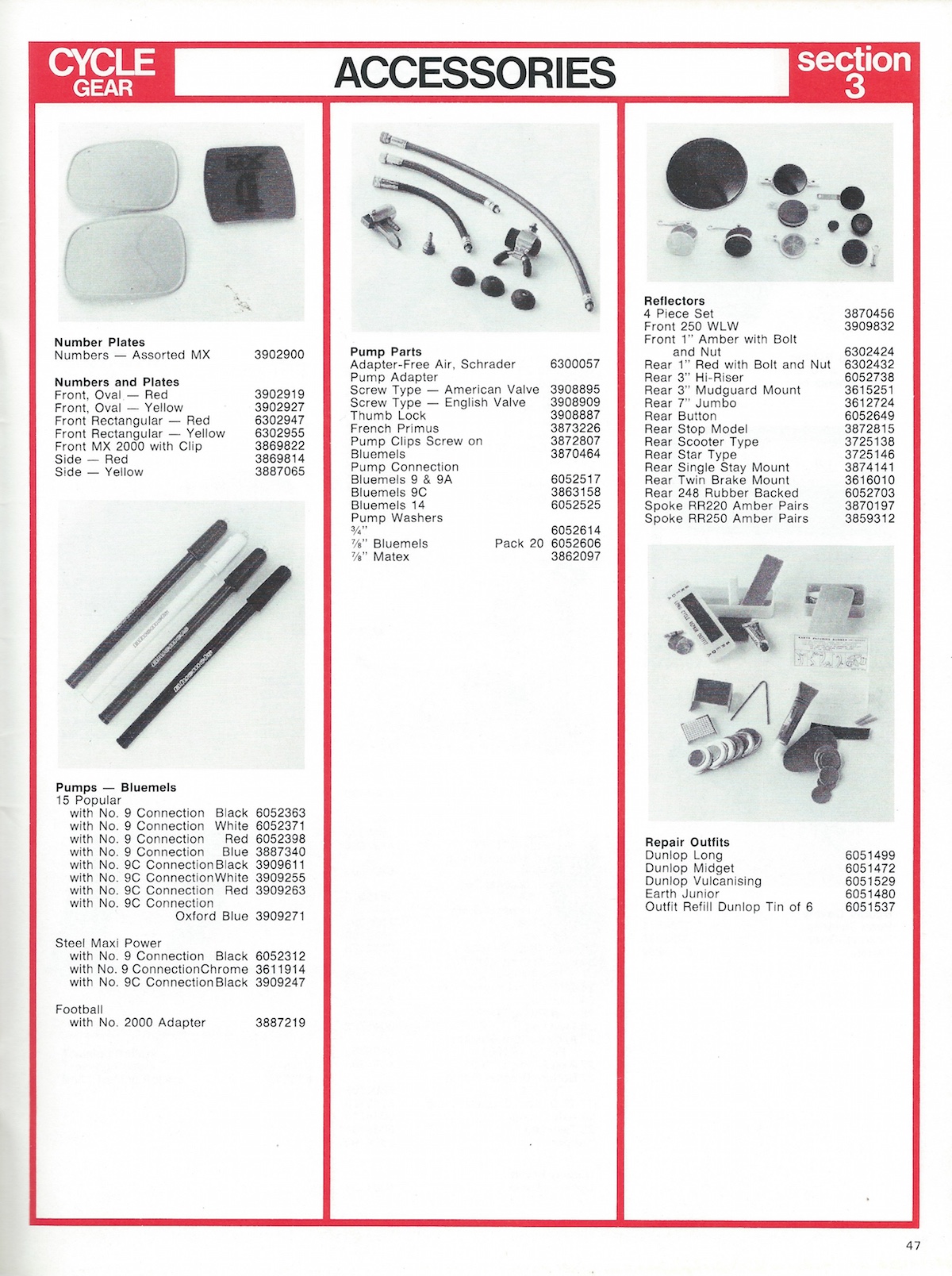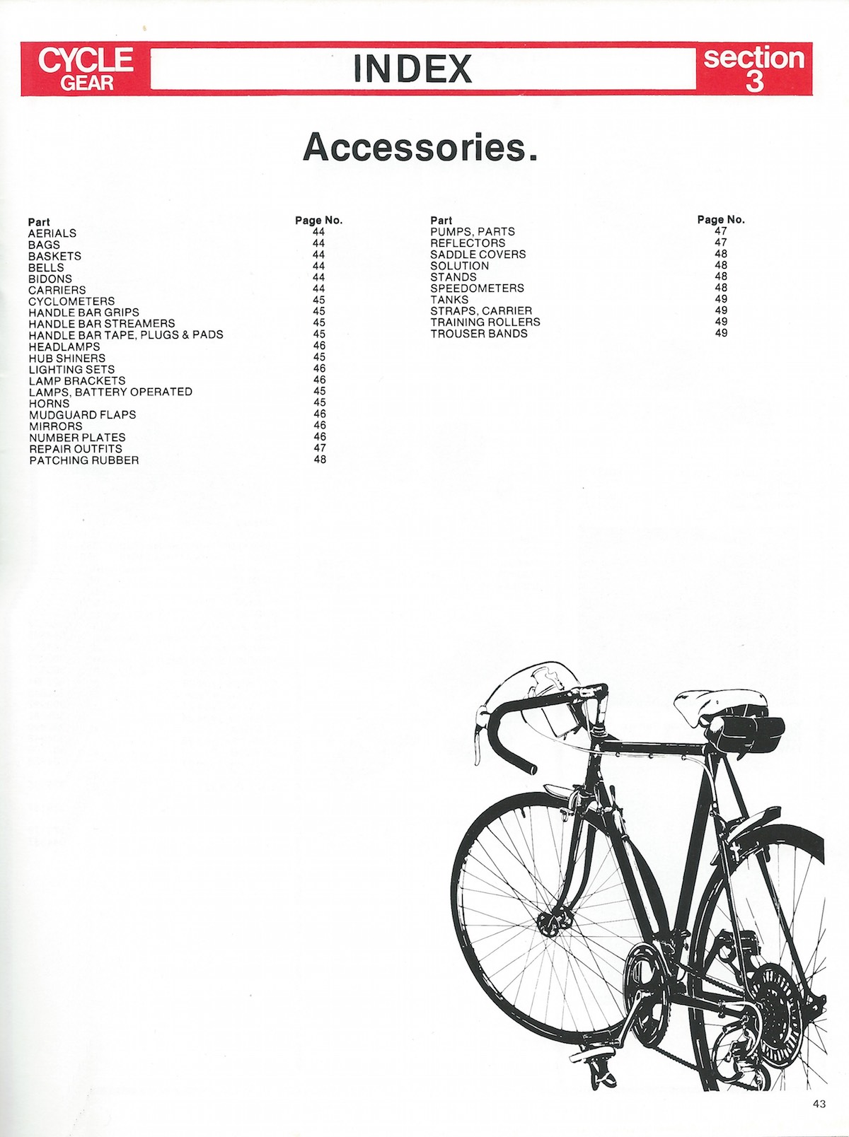 The second half of the catalogue is devoted to spare parts and accessories. Every single part of the bike range is available as a spare part including the 5/16" axle washer (part number 6056644) and the 1/8" Ball Bearing (part number 6042872). Accessories range from headlamps, bells and horns through to trouser bands.