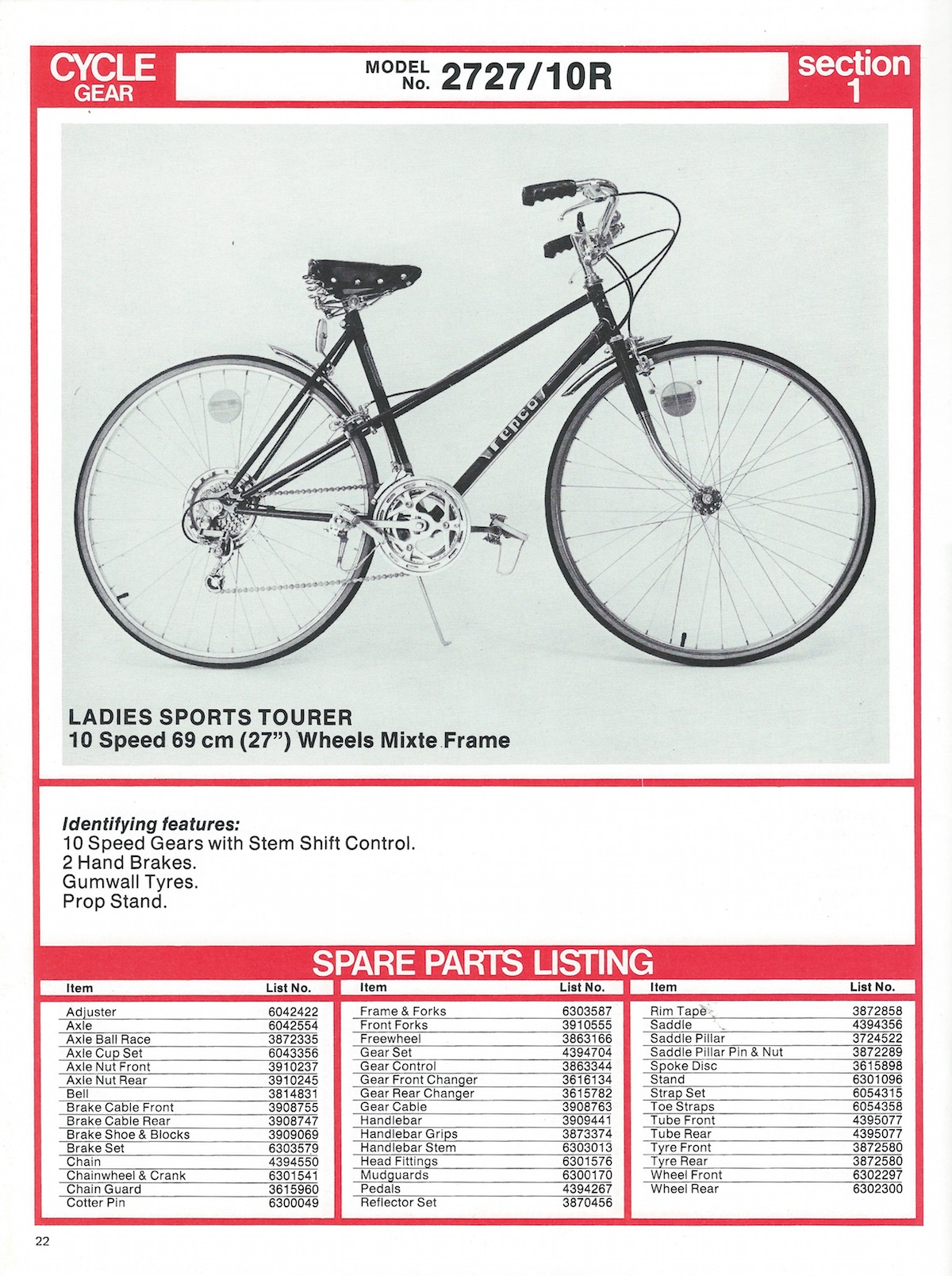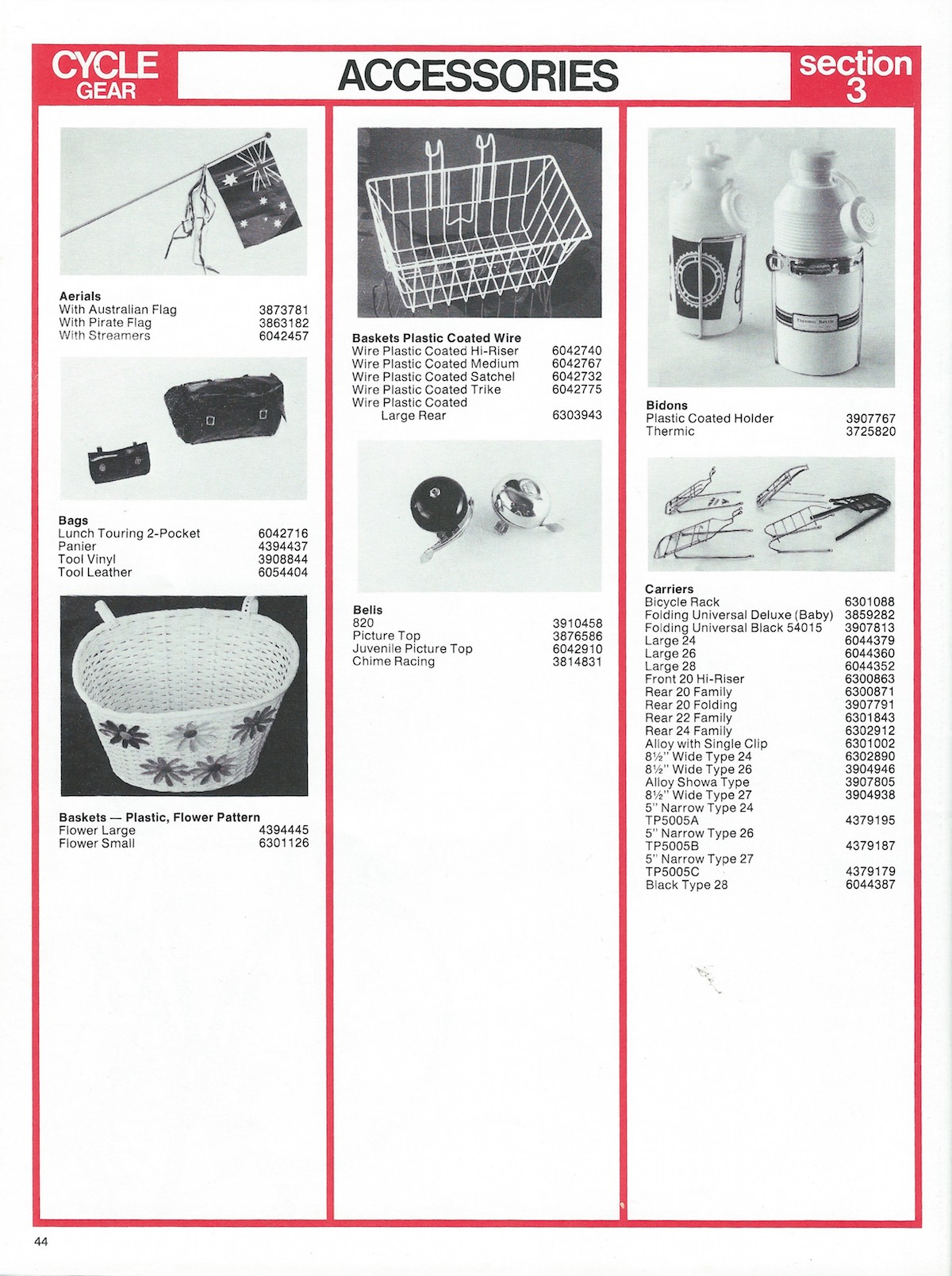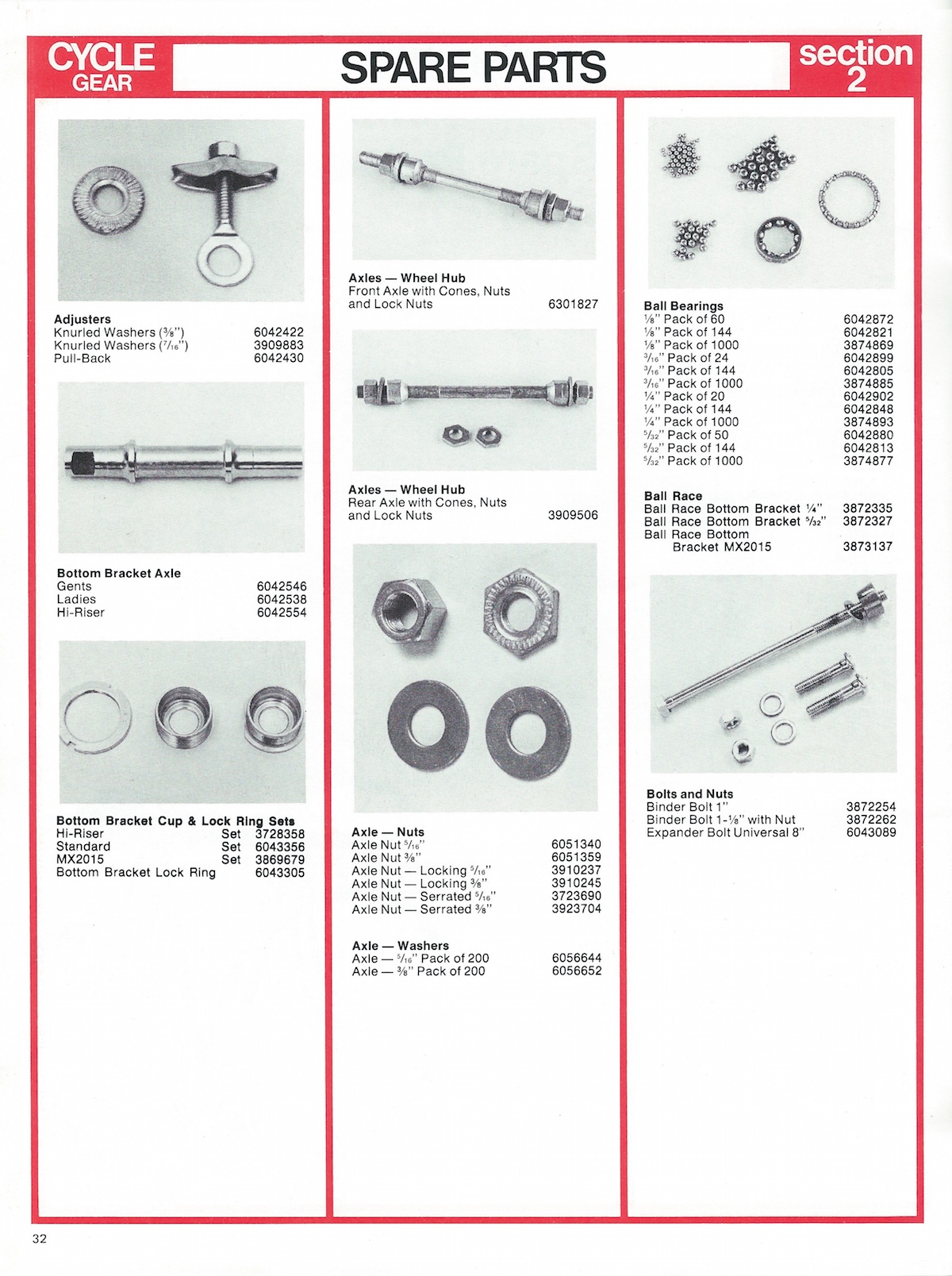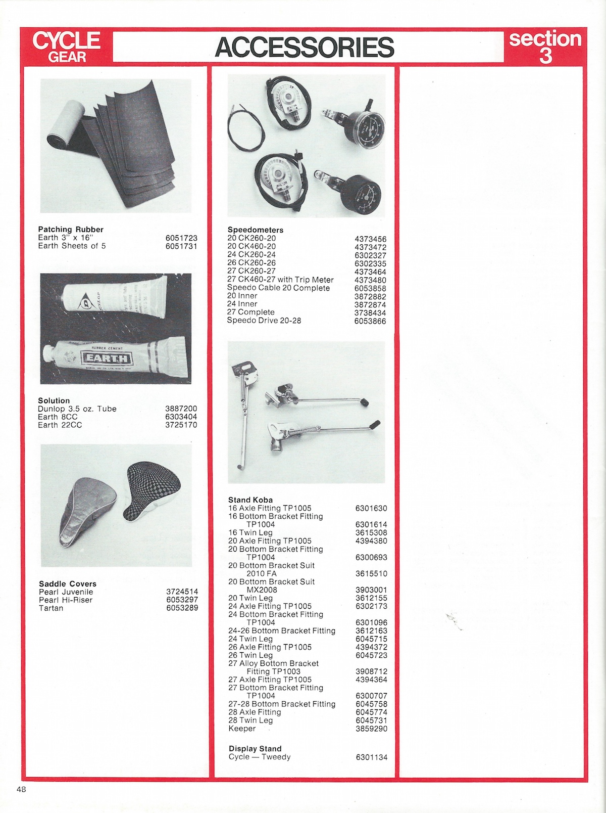 The second half of the catalogue is devoted to spare parts and accessories. Every single part of the bike range is available as a spare part including the 5/16" axle washer (part number 6056644) and the 1/8" Ball Bearing (part number 6042872). Accessories range from headlamps, bells and horns through to trouser bands.