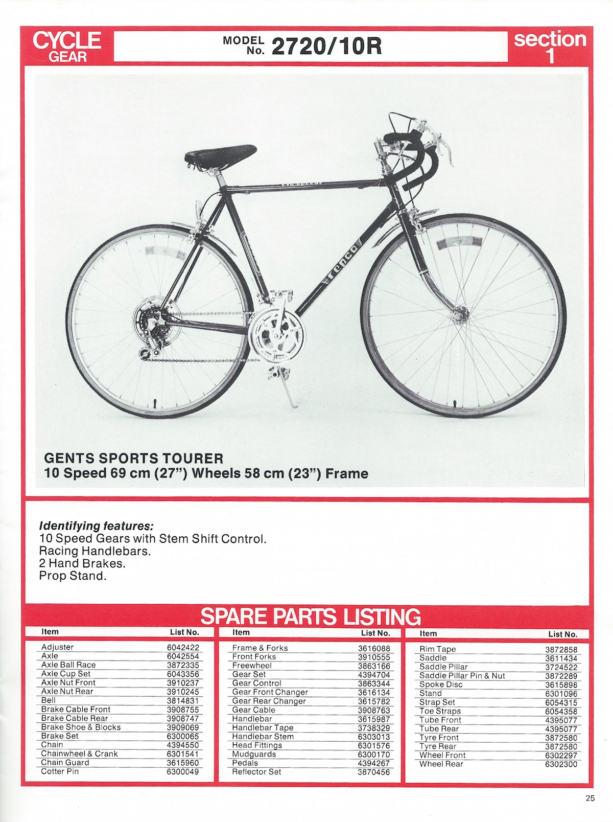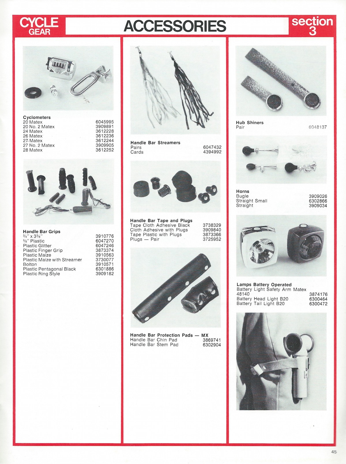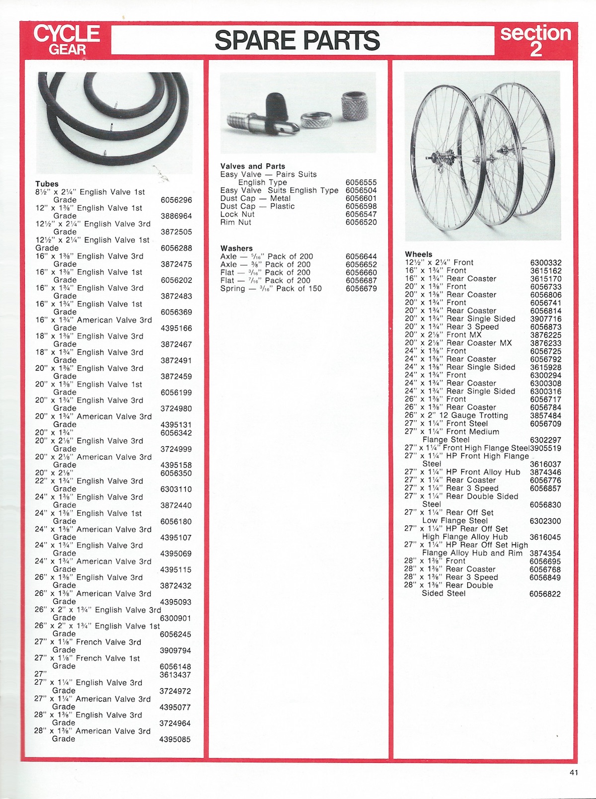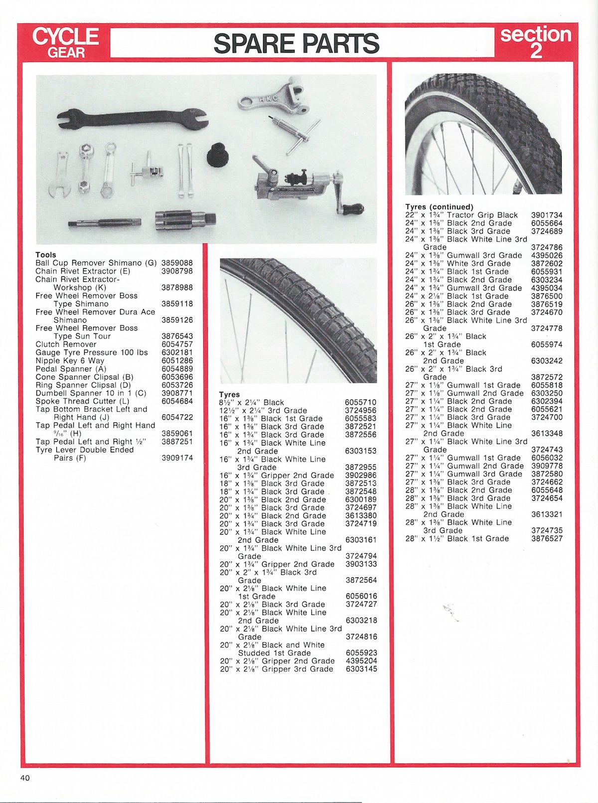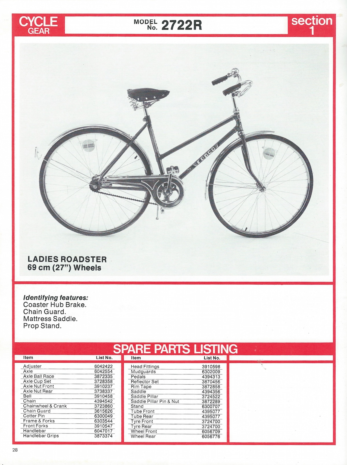 The second half of the catalogue is devoted to spare parts and accessories. Every single part of the bike range is available as a spare part including the 5/16" axle washer (part number 6056644) and the 1/8" Ball Bearing (part number 6042872). Accessories range from headlamps, bells and horns through to trouser bands.