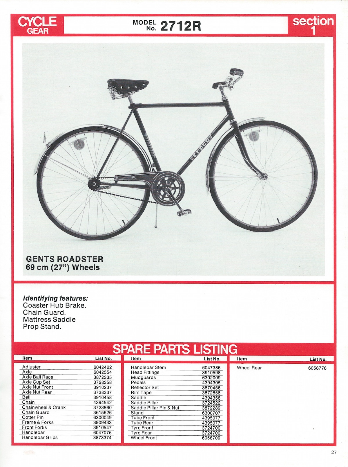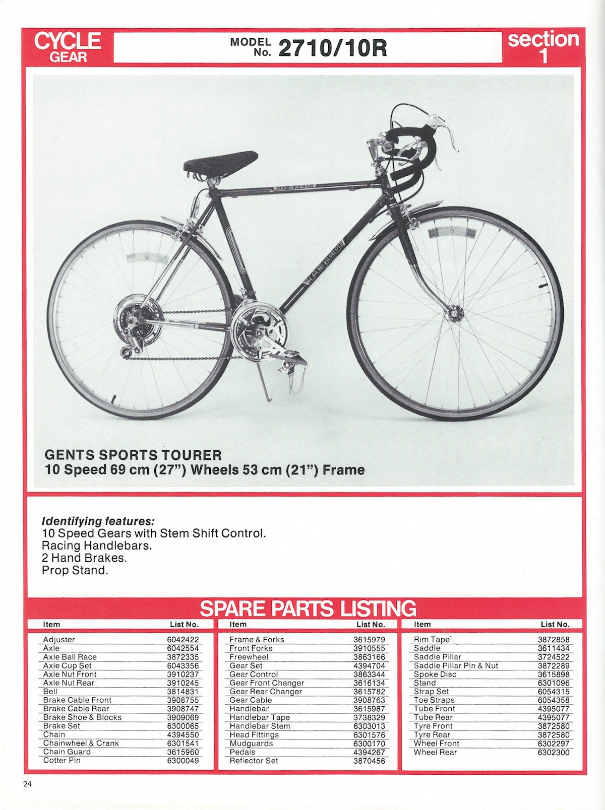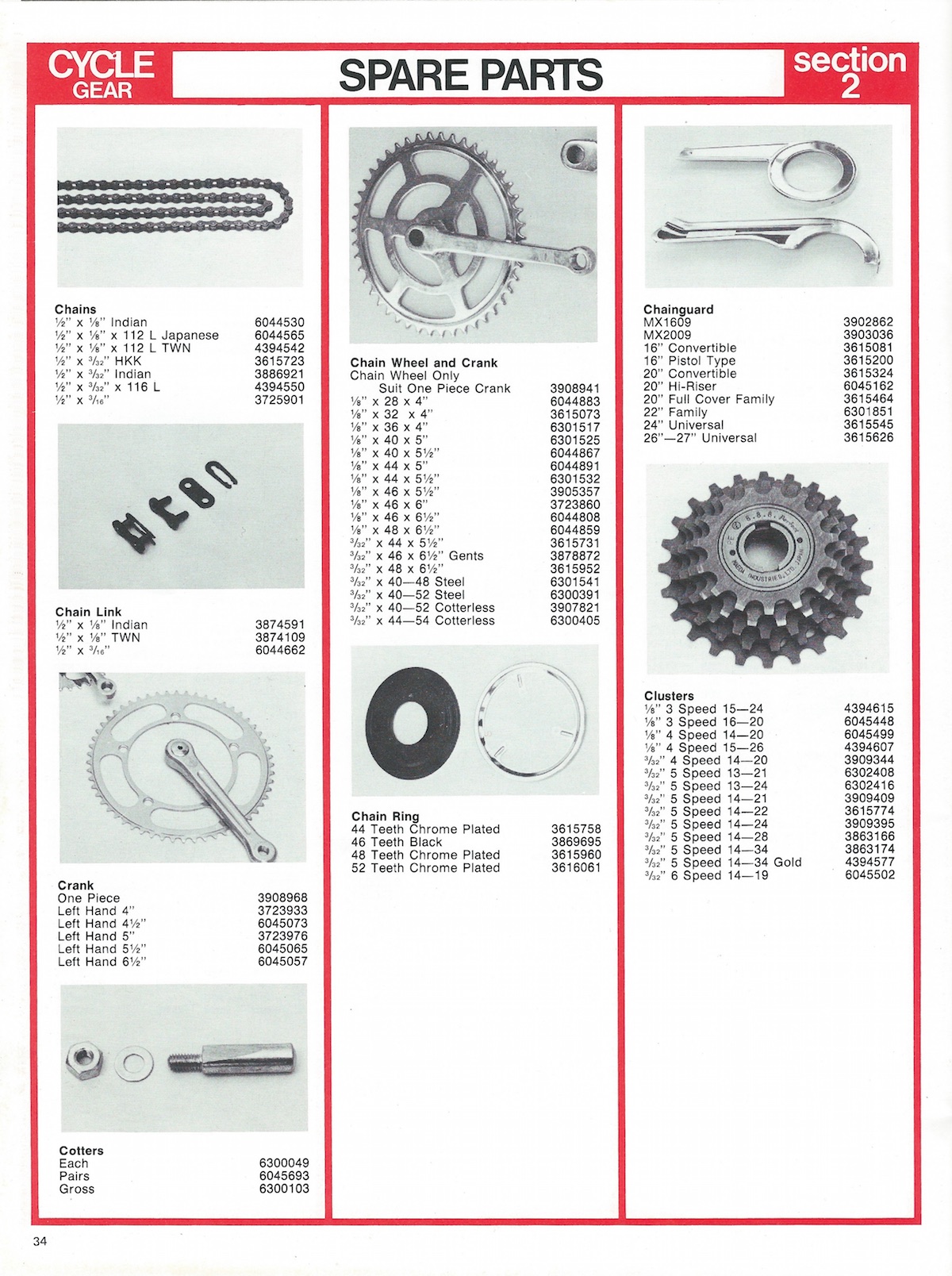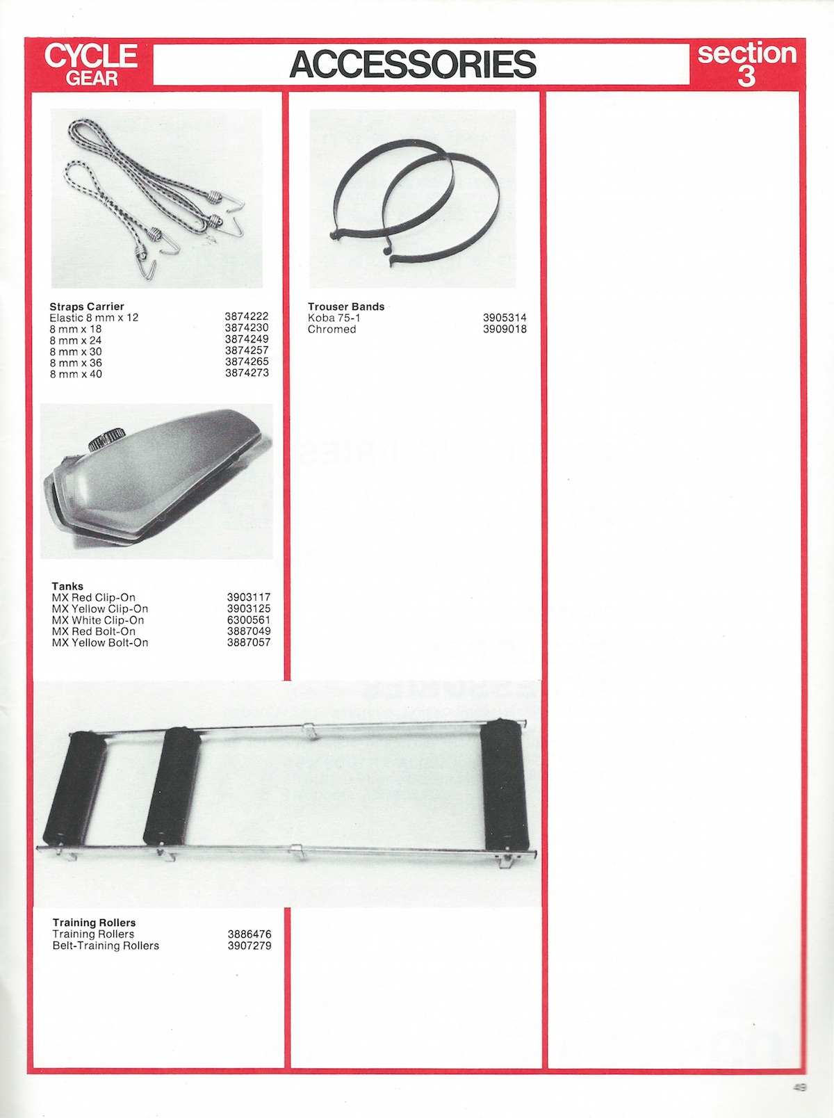 The second half of the catalogue is devoted to spare parts and accessories. Every single part of the bike range is available as a spare part including the 5/16" axle washer (part number 6056644) and the 1/8" Ball Bearing (part number 6042872). Accessories range from headlamps, bells and horns through to trouser bands.