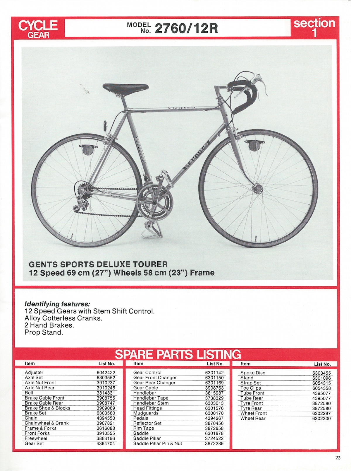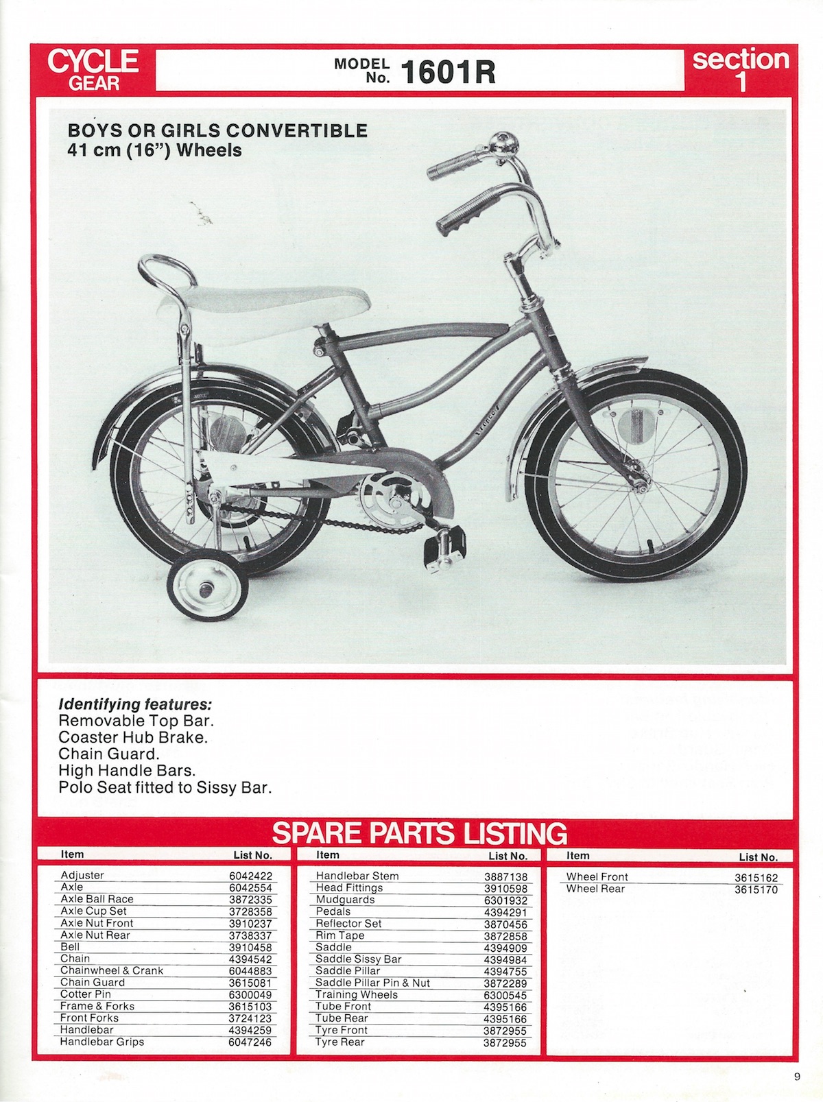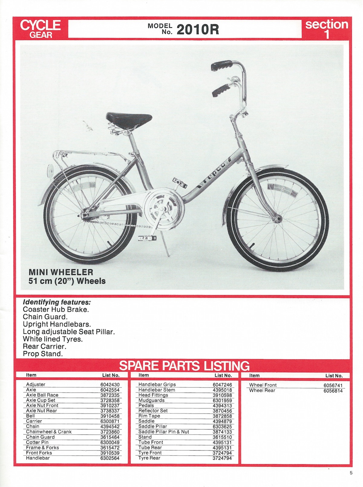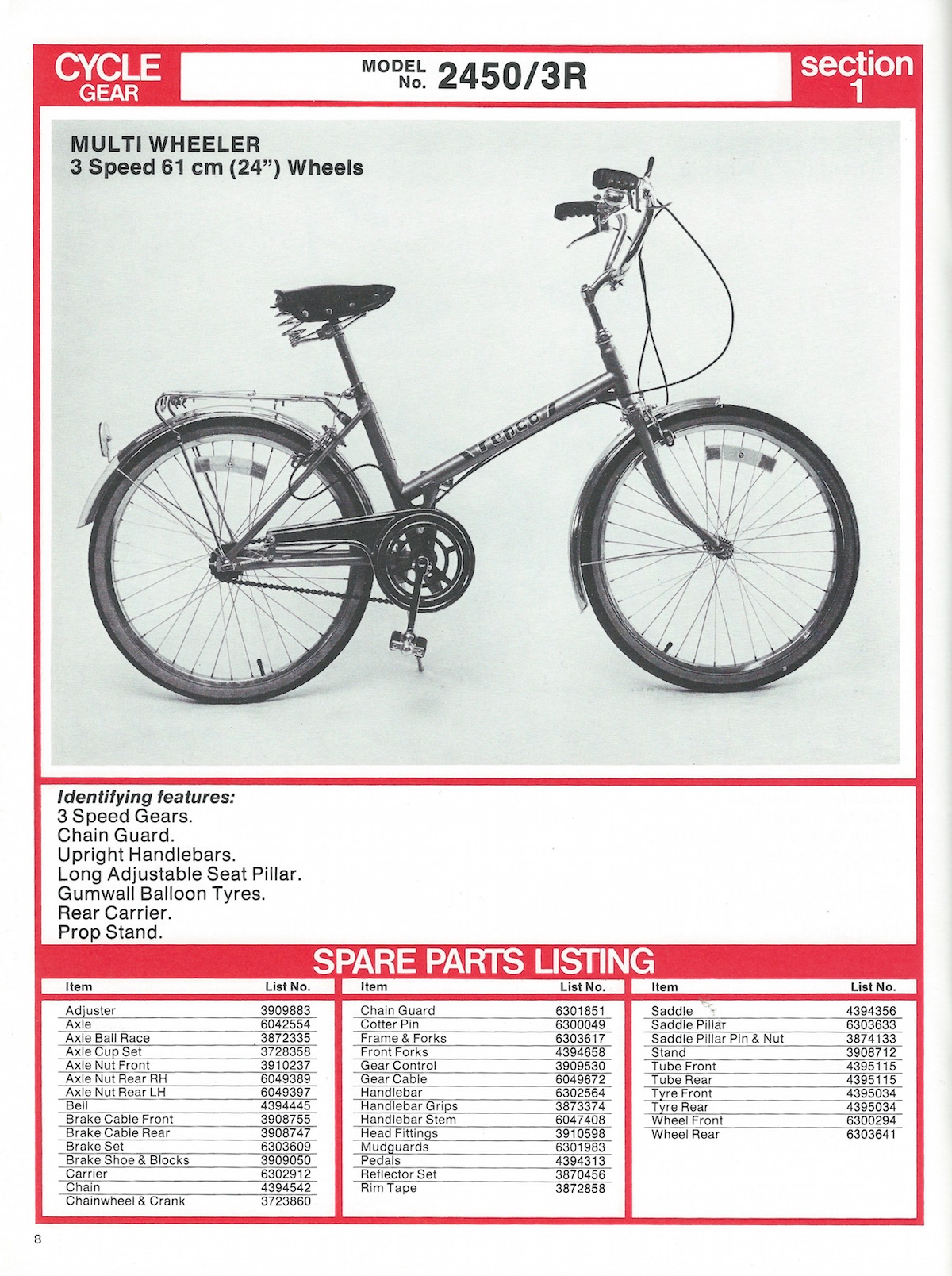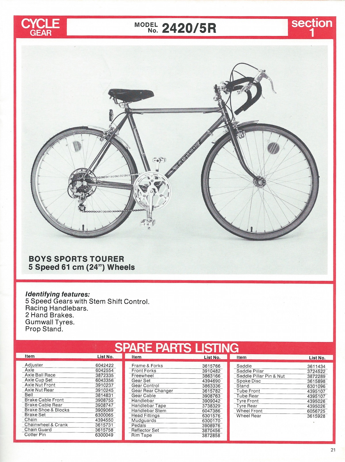 The second half of the catalogue is devoted to spare parts and accessories. Every single part of the bike range is available as a spare part including the 5/16" axle washer (part number 6056644) and the 1/8" Ball Bearing (part number 6042872). Accessories range from headlamps, bells and horns through to trouser bands.