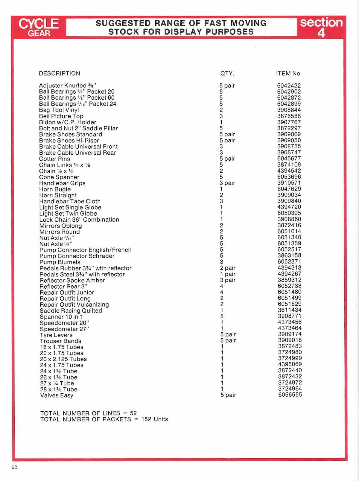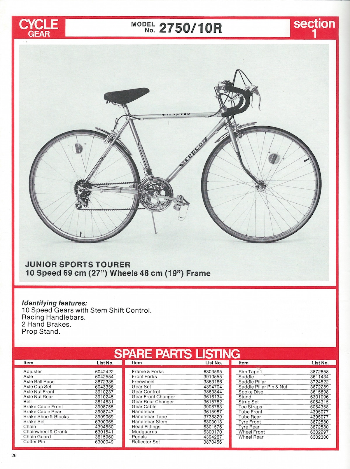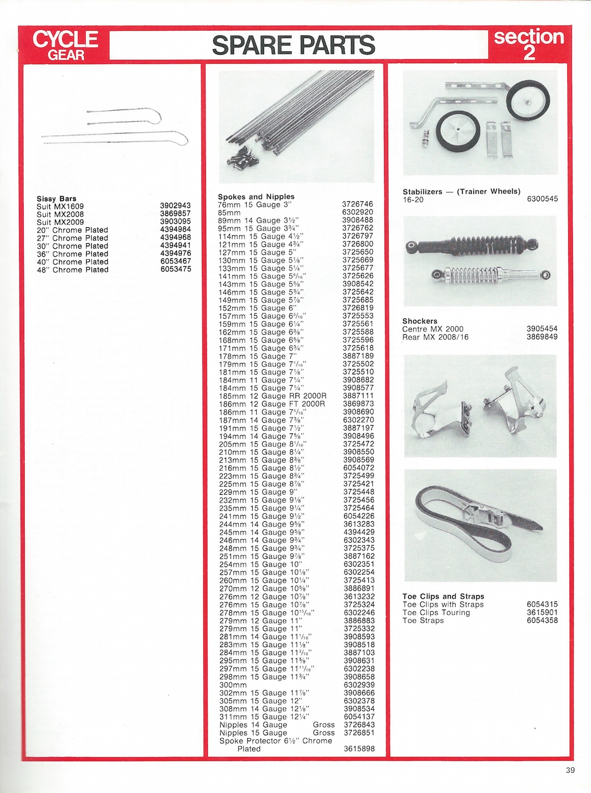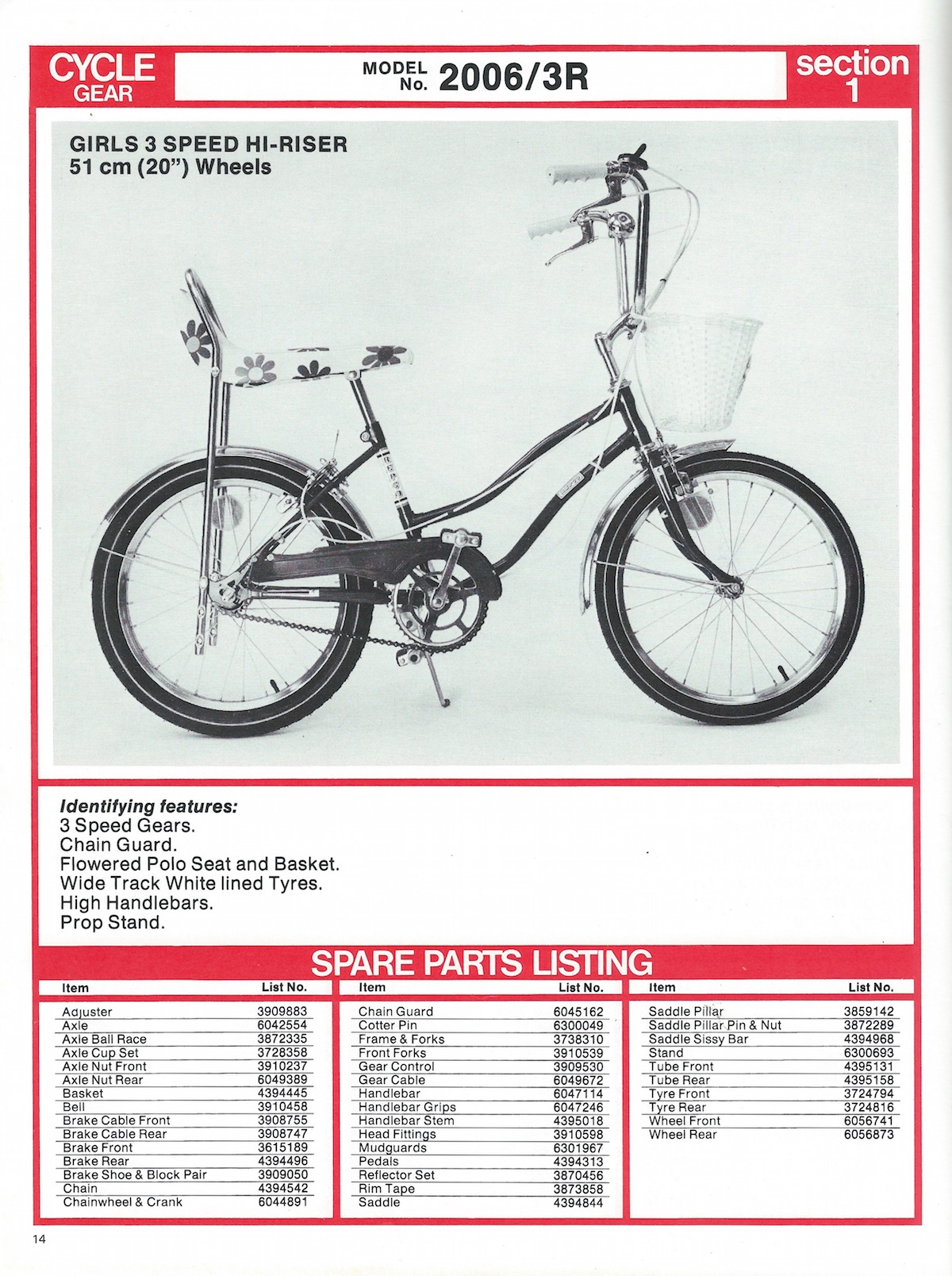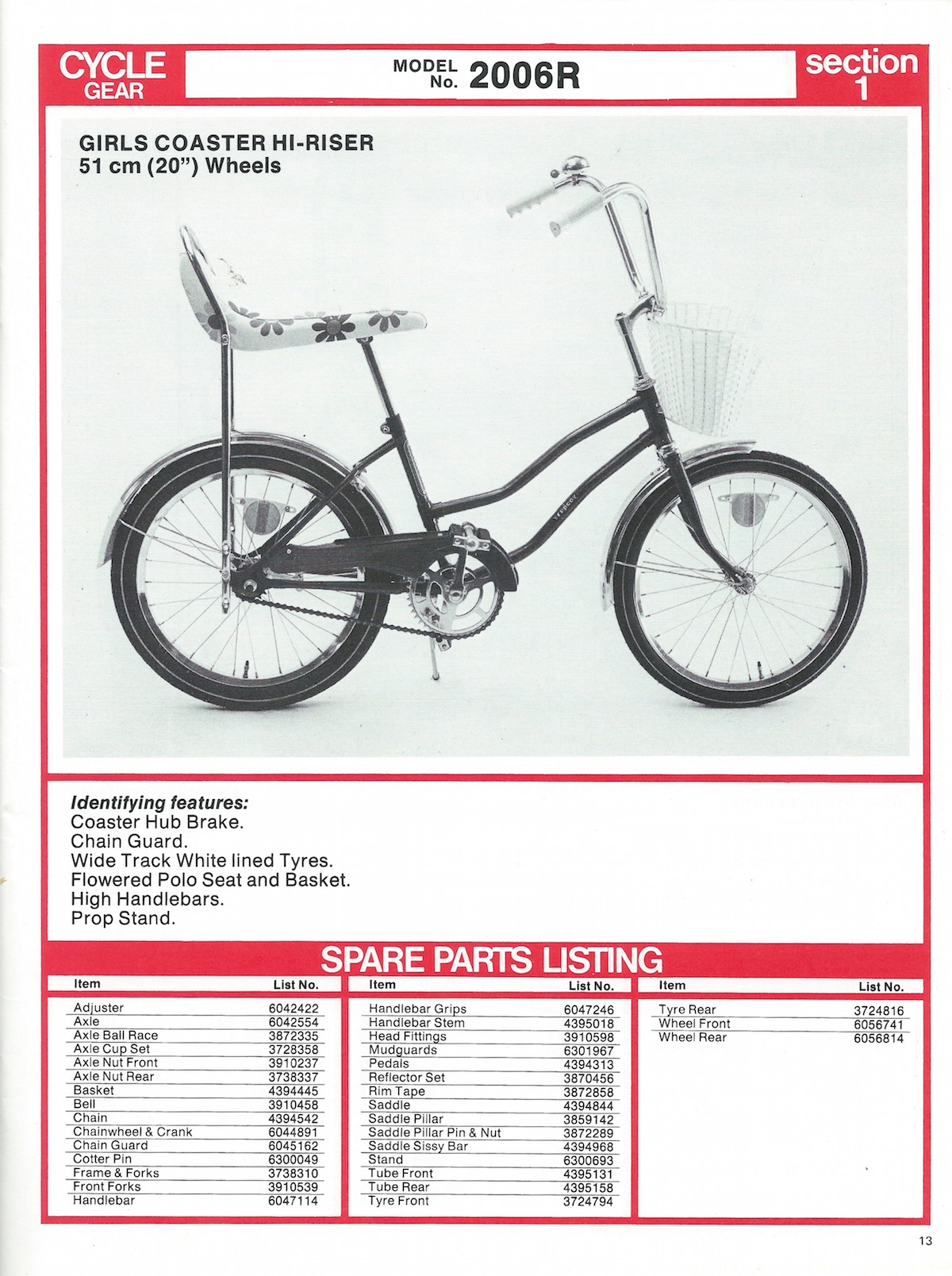 The second half of the catalogue is devoted to spare parts and accessories. Every single part of the bike range is available as a spare part including the 5/16" axle washer (part number 6056644) and the 1/8" Ball Bearing (part number 6042872). Accessories range from headlamps, bells and horns through to trouser bands.