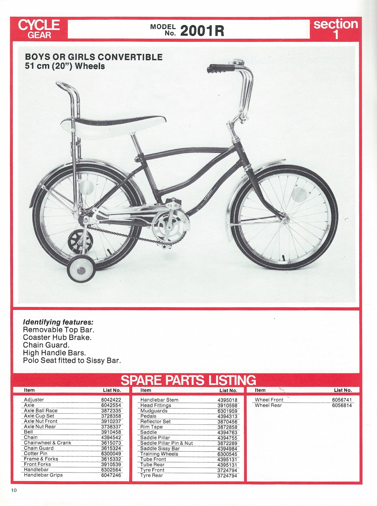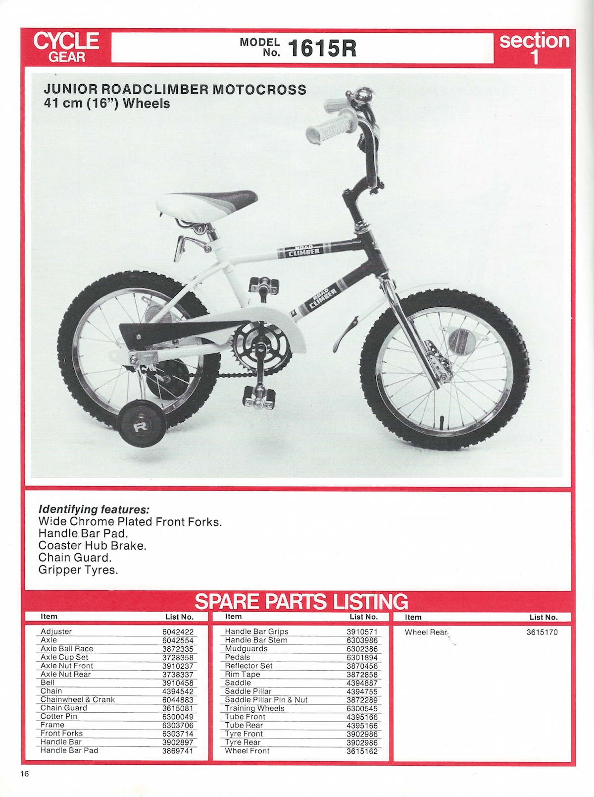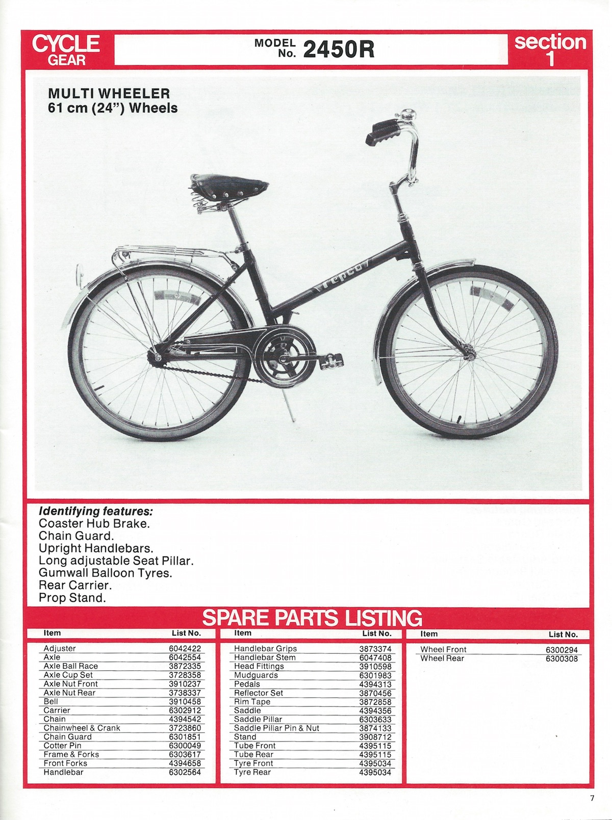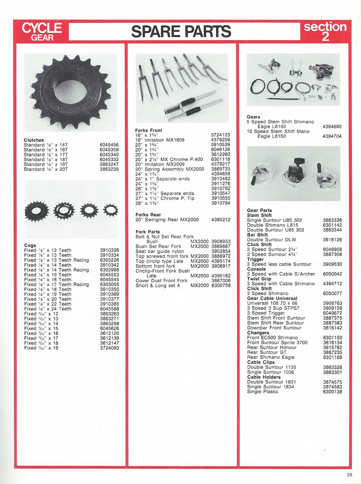 The second half of the catalogue is devoted to spare parts and accessories. Every single part of the bike range is available as a spare part including the 5/16" axle washer (part number 6056644) and the 1/8" Ball Bearing (part number 6042872). Accessories range from headlamps, bells and horns through to trouser bands.