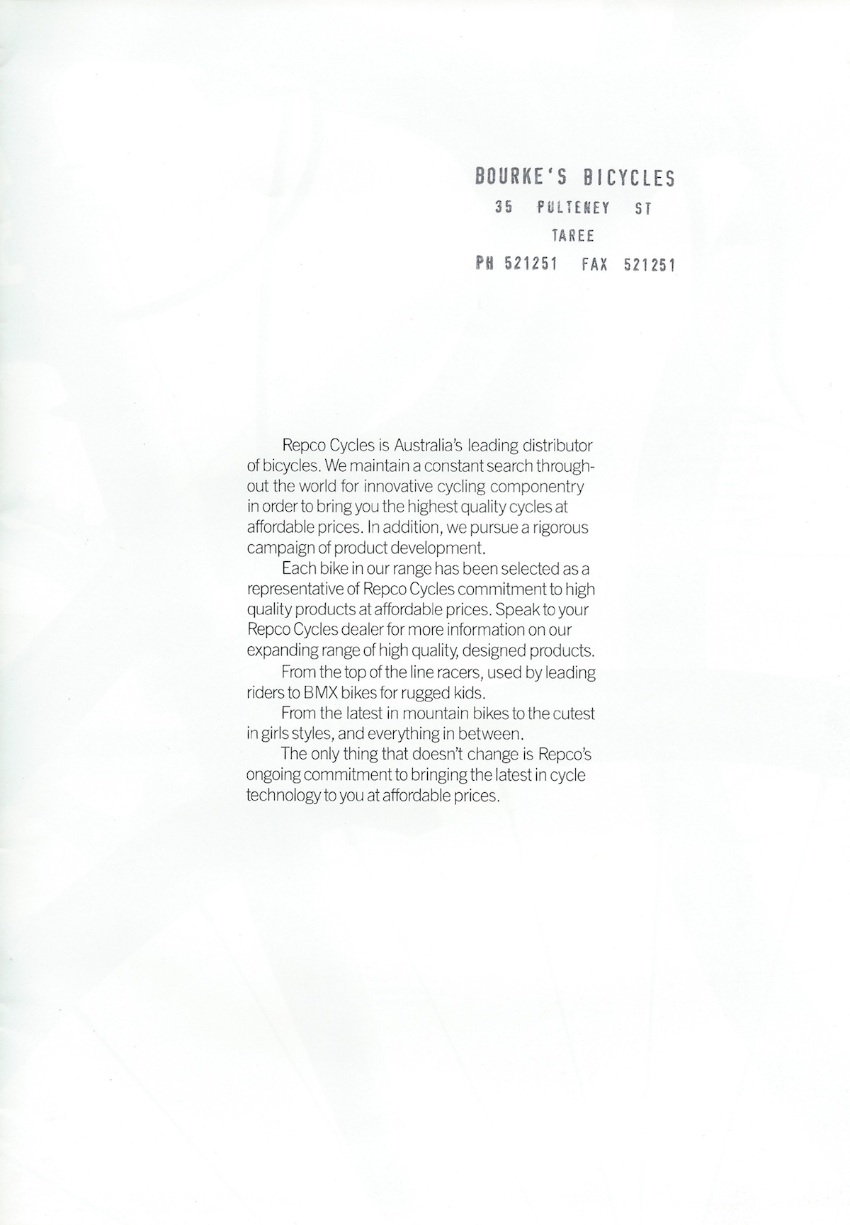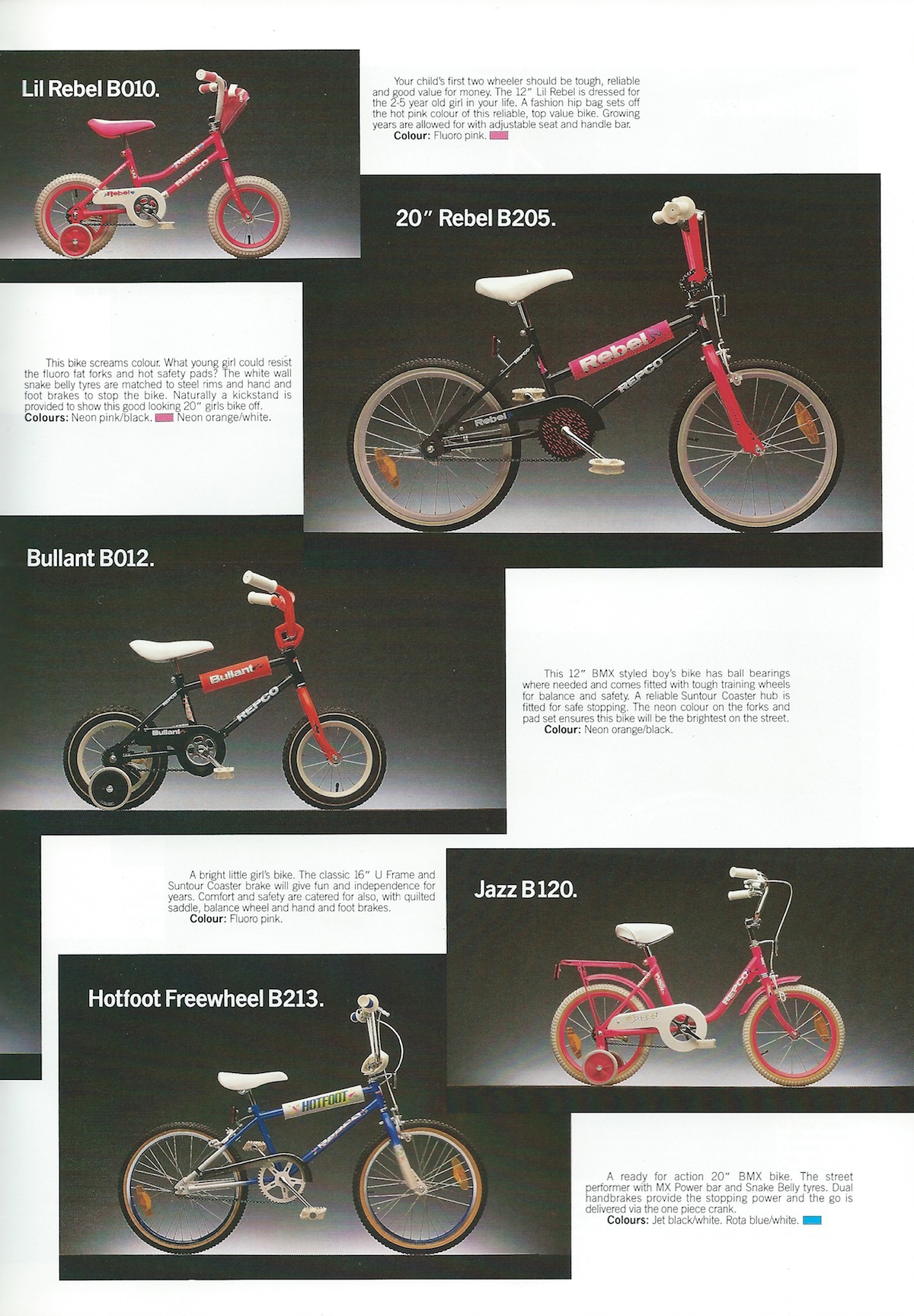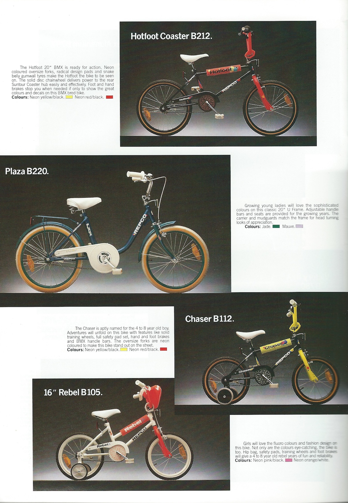 This mid to late '90s catalogue was generously submitted by Brian of Bourkes Bicycles in Taree. The Hotfoot range is down to two models - a 20" freewheel and a 20" coaster model. The 16" version has been renamed a Chaser (boys model) and Rebel (girls model) although they looks identical to the 20" models.