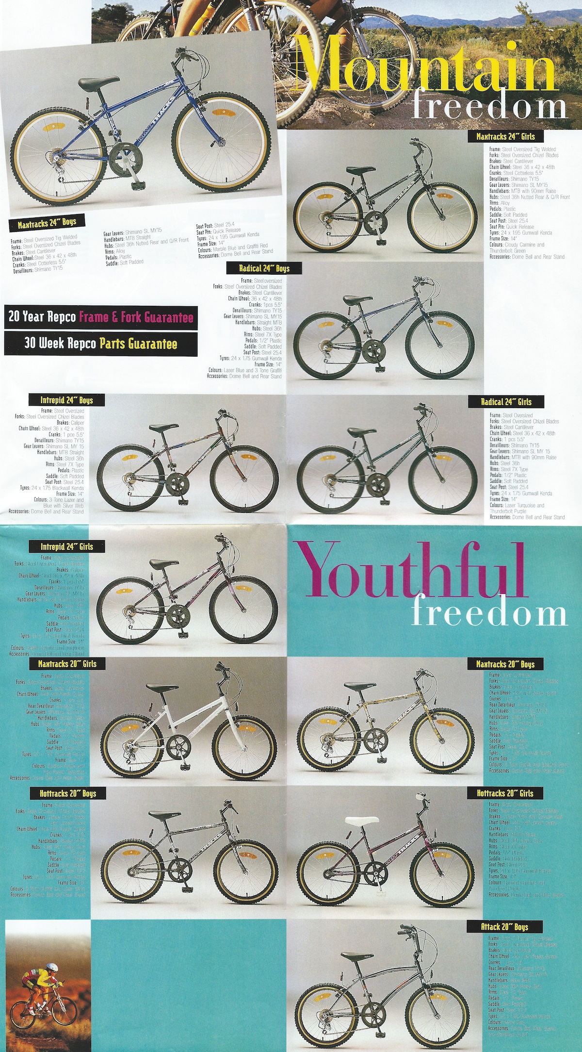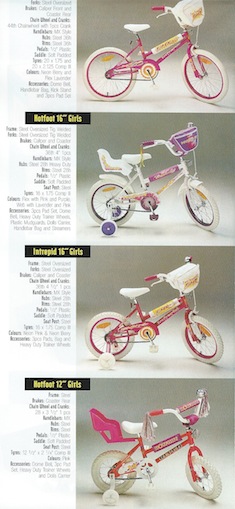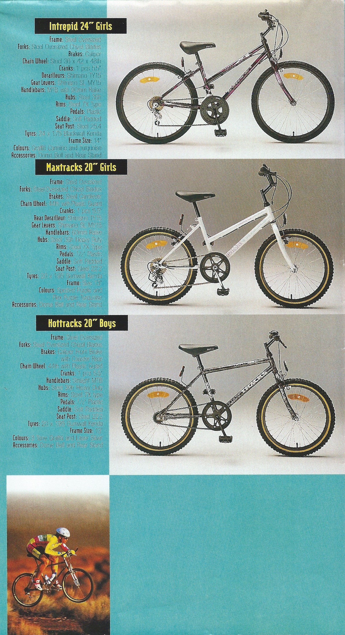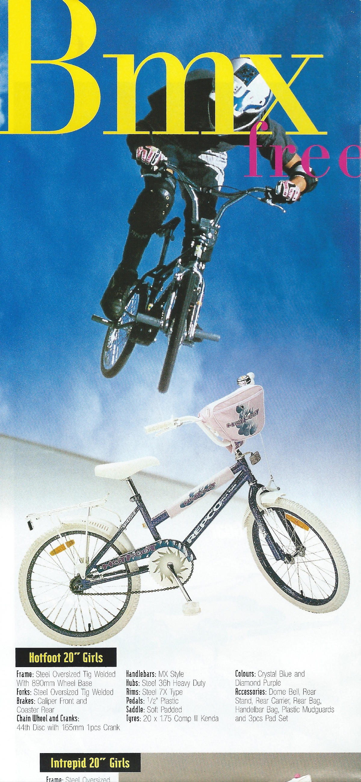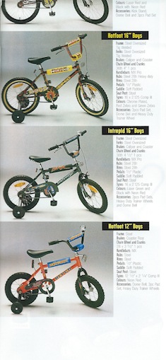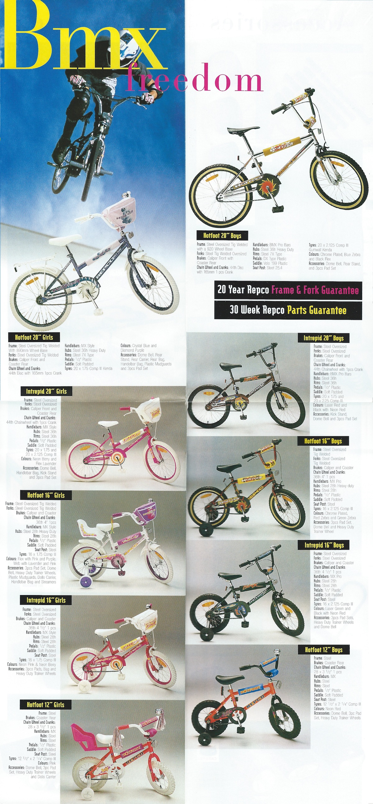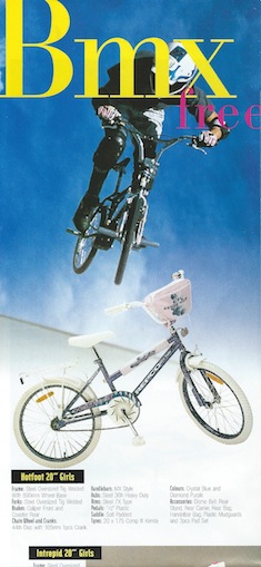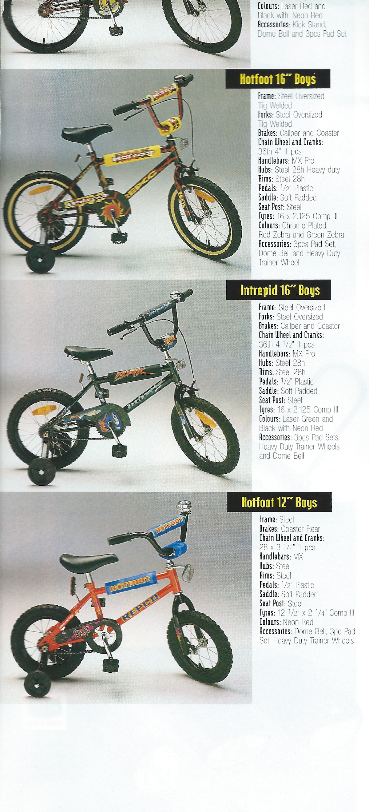 The 1995 catalogue features 6 Hotfoots - girls and boys 20", 16" and 12" - and four Intrepids - girls and boys 20" and 16". The page is adorned with a picture of a rider jumping a Haro Master complete with a bash guard but this does not appear in the catalogue at all!