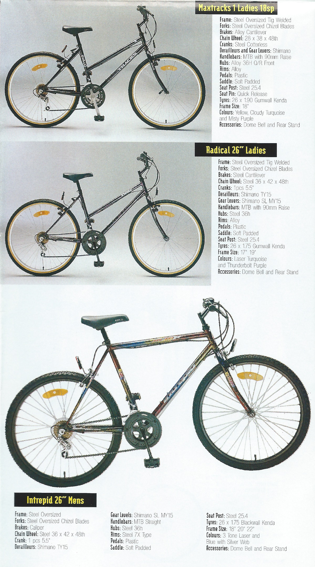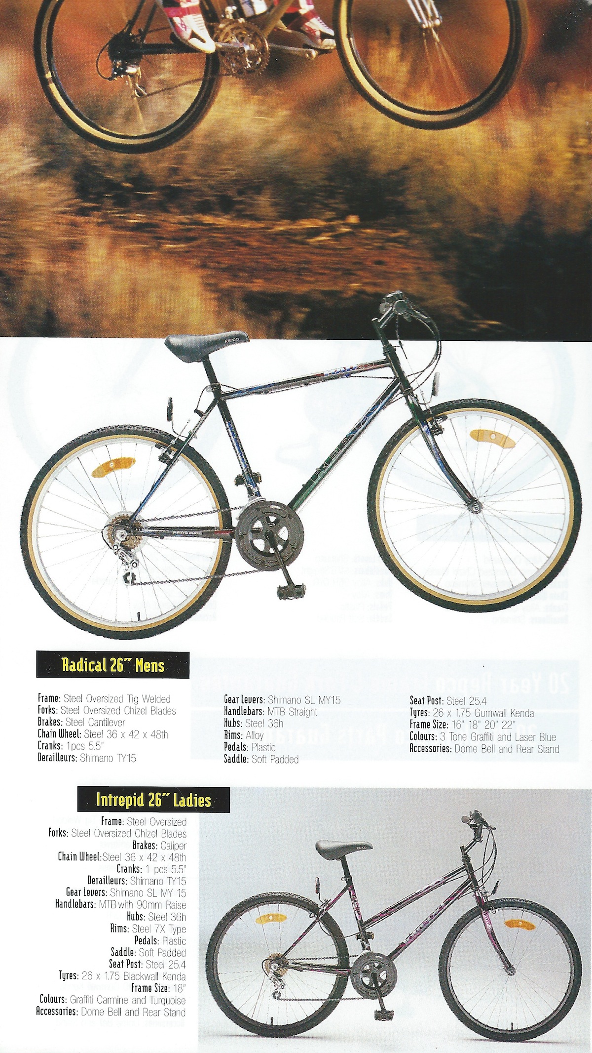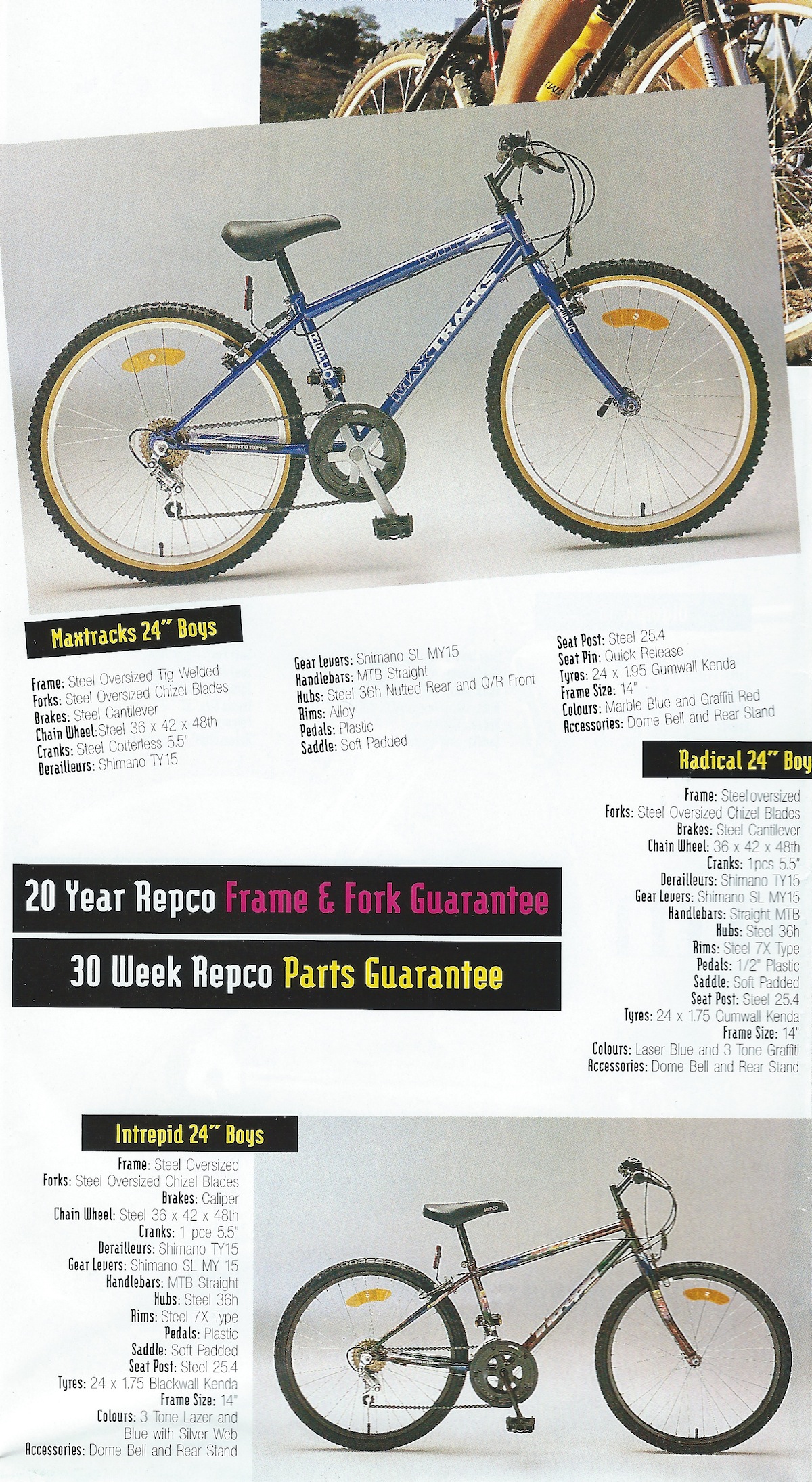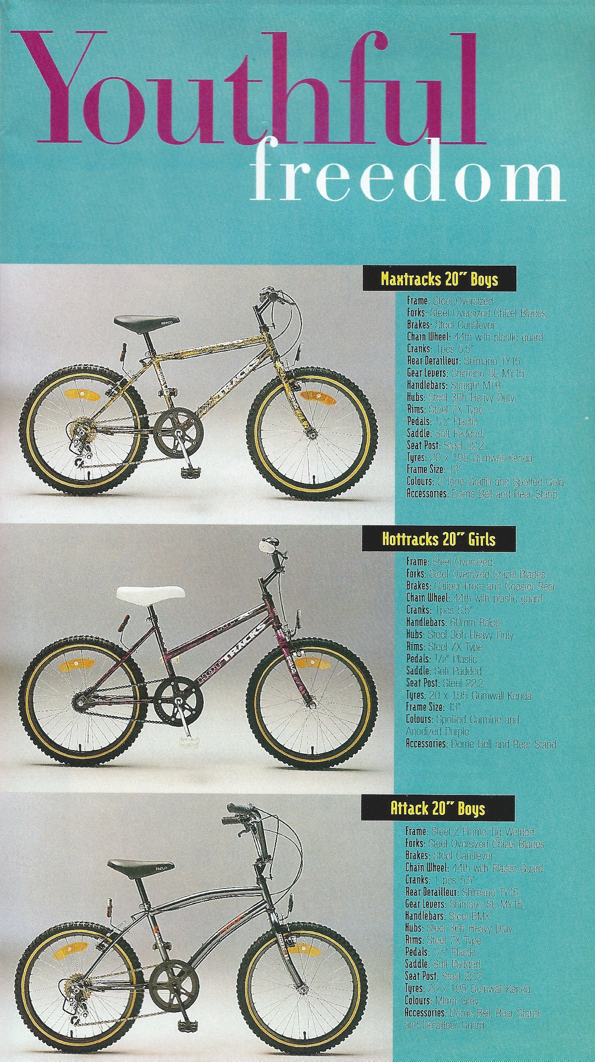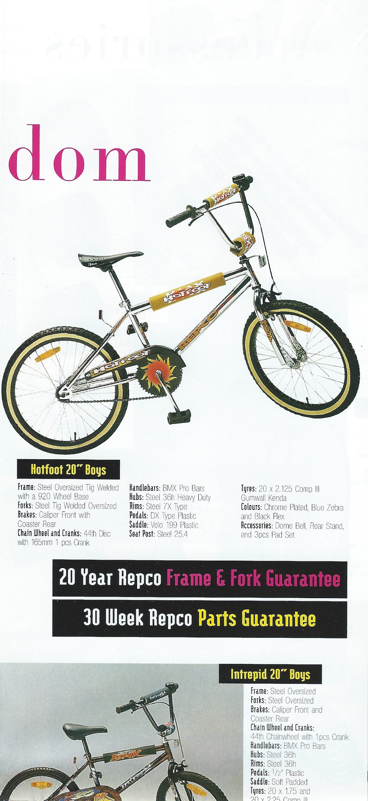 The 1995 catalogue features 6 Hotfoots - girls and boys 20", 16" and 12" - and four Intrepids - girls and boys 20" and 16". The page is adorned with a picture of a rider jumping a Haro Master complete with a bash guard but this does not appear in the catalogue at all!
