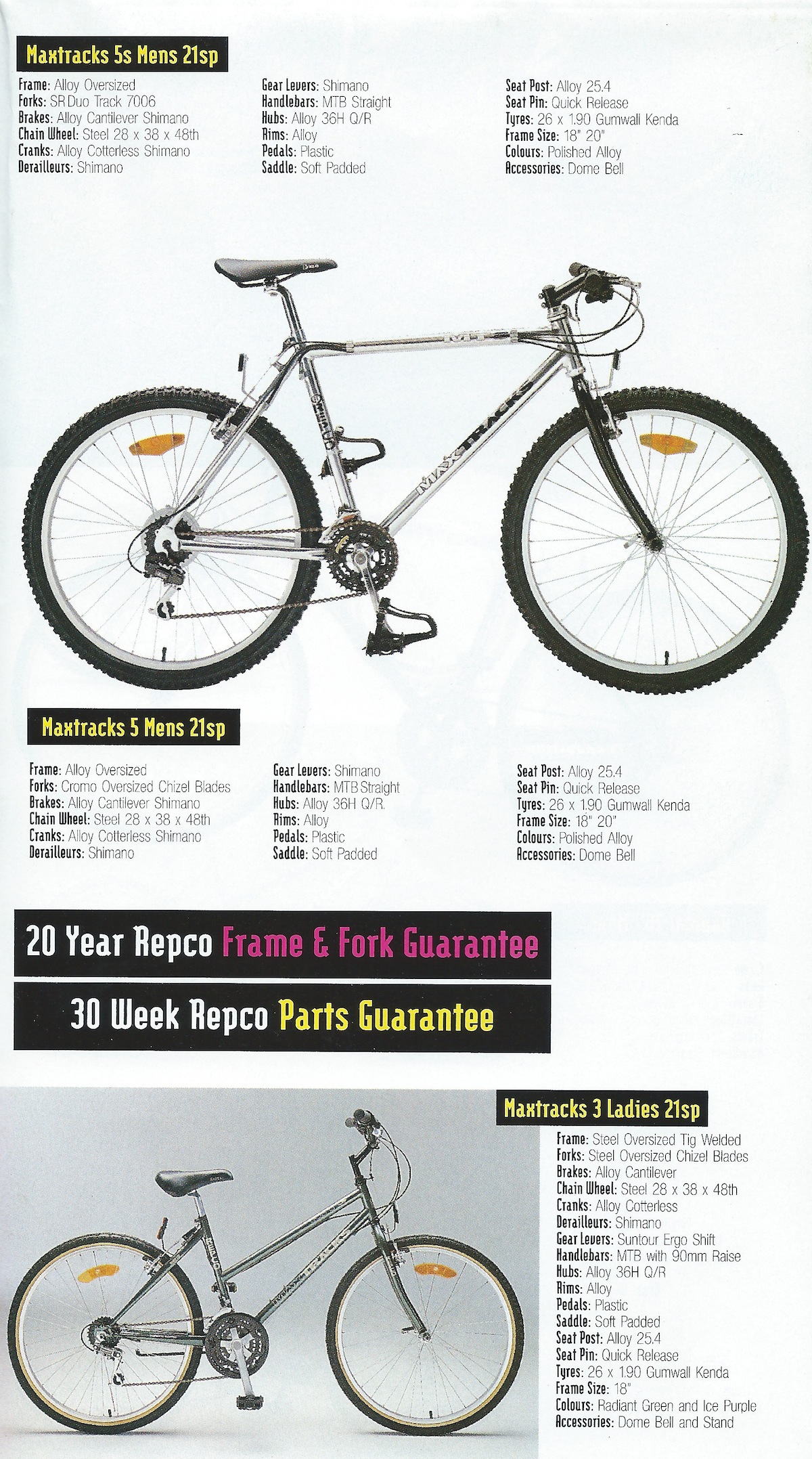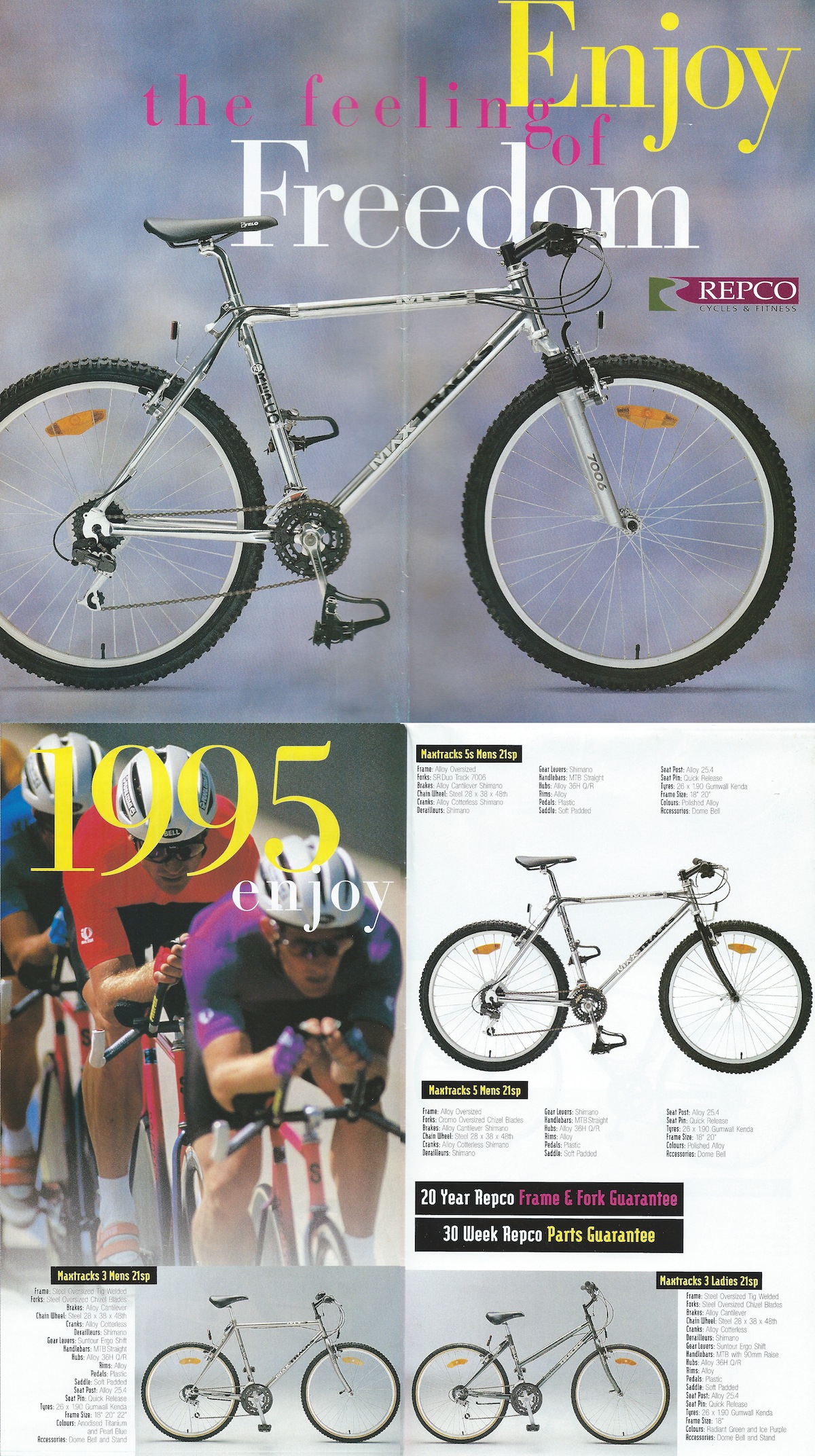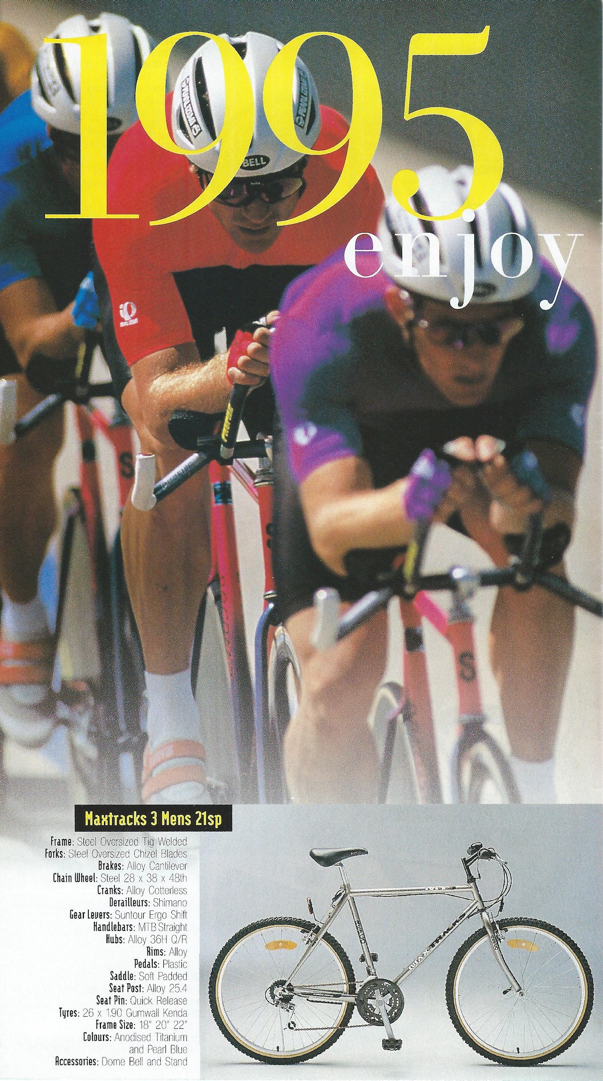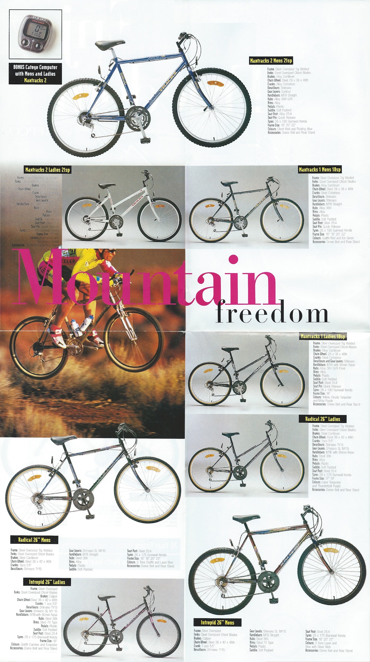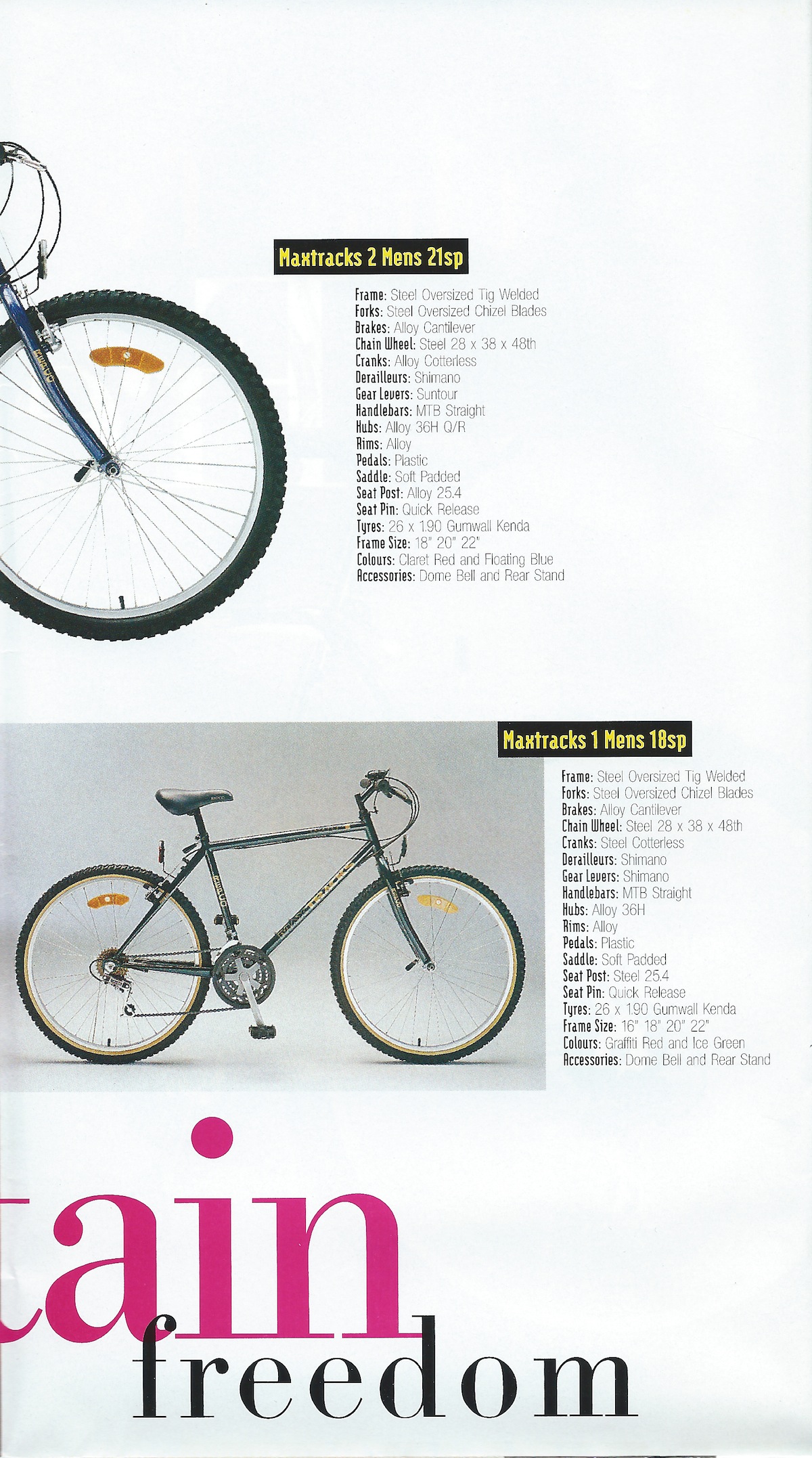 The 1995 catalogue features 6 Hotfoots - girls and boys 20", 16" and 12" - and four Intrepids - girls and boys 20" and 16". The page is adorned with a picture of a rider jumping a Haro Master complete with a bash guard but this does not appear in the catalogue at all!