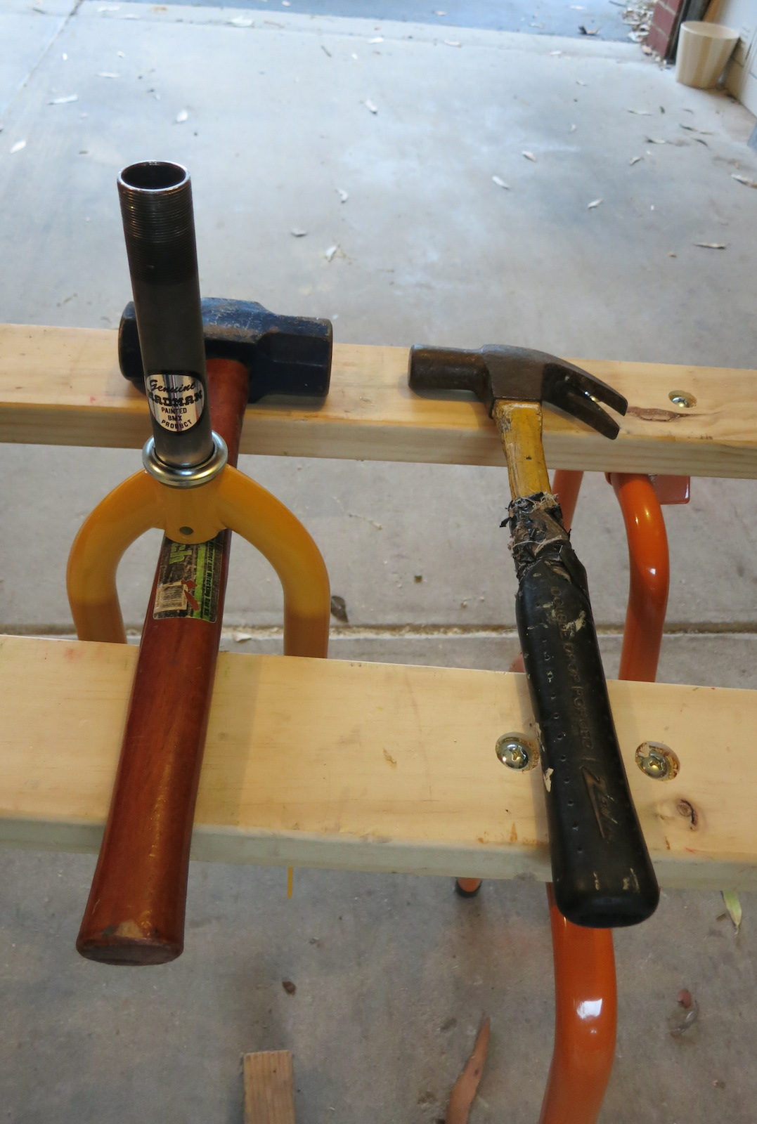The best way to fit a crown race to a set of forks is to find a length of pipe with an inside diameter close in size to the outside diameter of the steerer tube. With this pipe fitted over the steerer tube, you can tap the race into place. Alternatively, you can tap the race down using a nail punch while taking care not to slip and damage the bearing face. I suspend the forks between two horses so that any pressure is absorbed byt the steerer tube only.