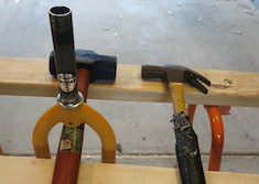 There are a number of specialist tools for fitting headset cups but they can be fitted using a set of sash clamps as shown below. Care must be taken to ensure that the cups 'bottom out' on the head tube. If the brackets are fitted correctly, the bearings will not be parallel to one another resulting in problems.