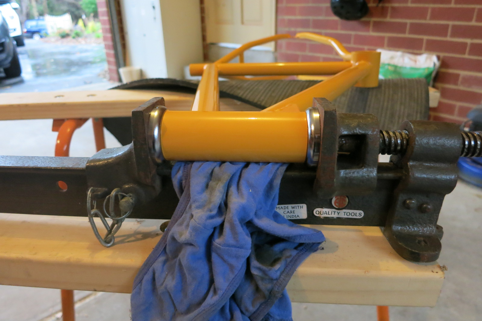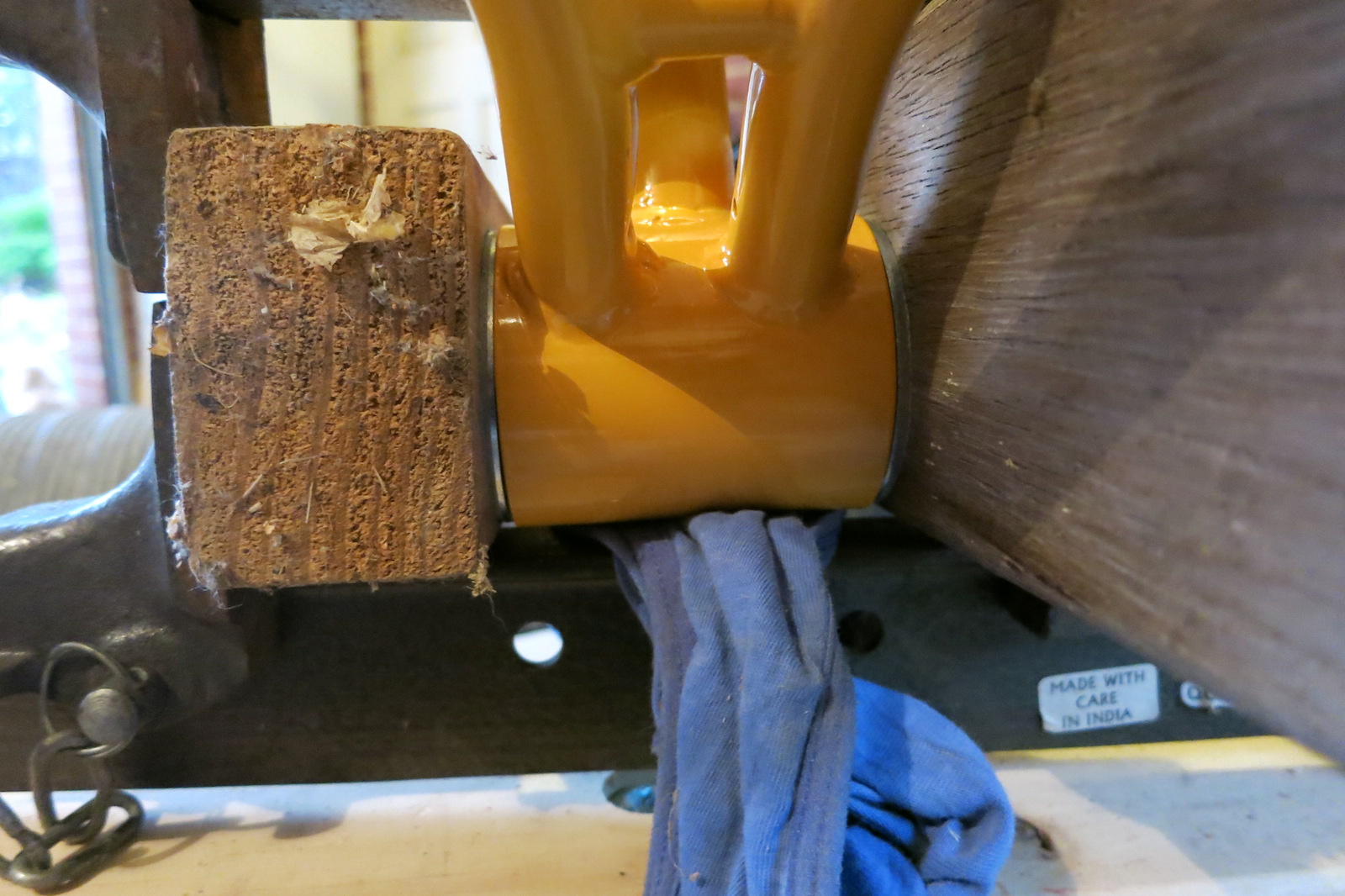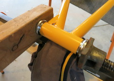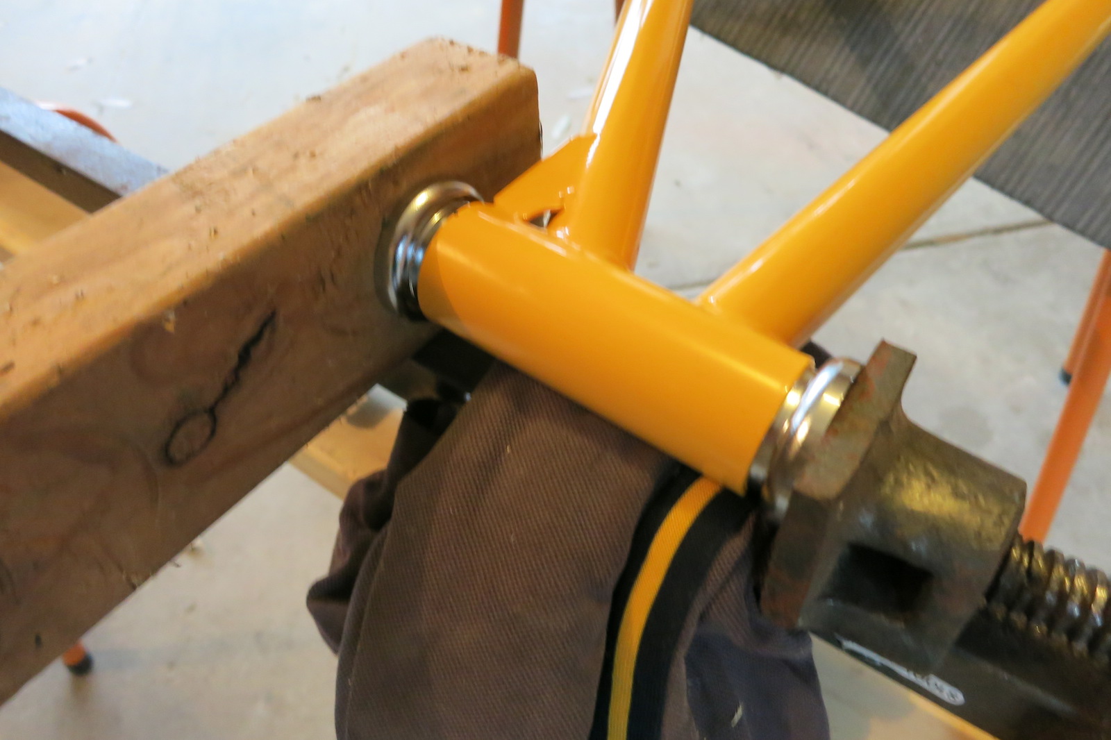 The cups for the bottom bracket can be fitted using sash clamps as well. I use two lengths of timber to protect the edges of the cups. These can be tricky to fit as the cups will tend to go in cocked especially if the clamping area of the sash is smaller than that of the cup 'face'. A second clamp fitted from above helps remedy this by allowing you to adjust each clamp separately.