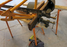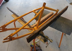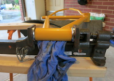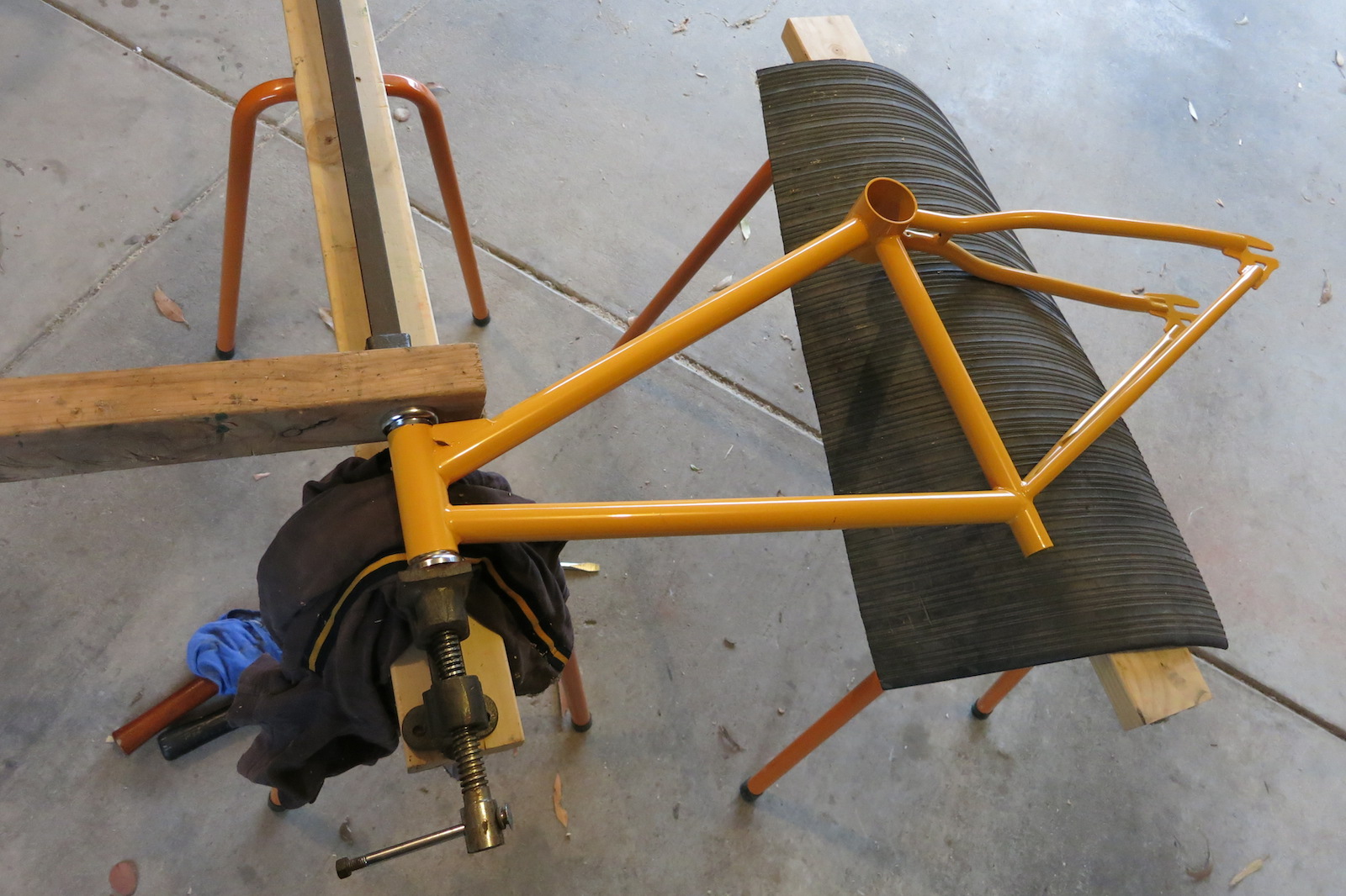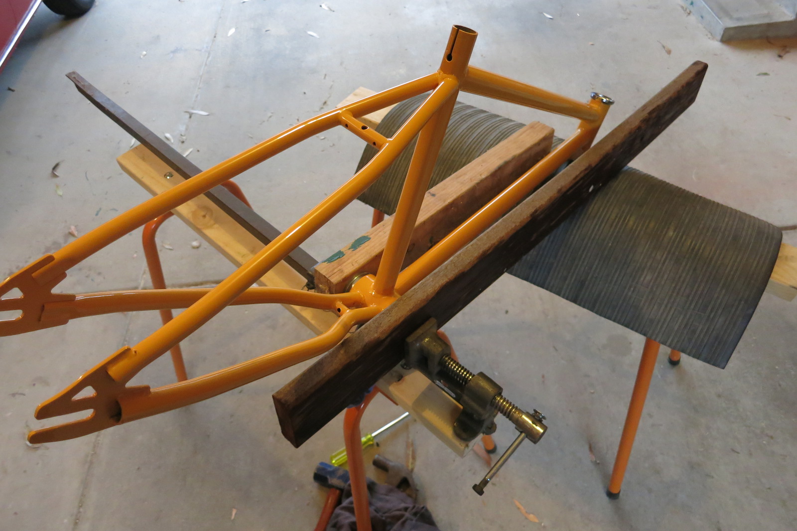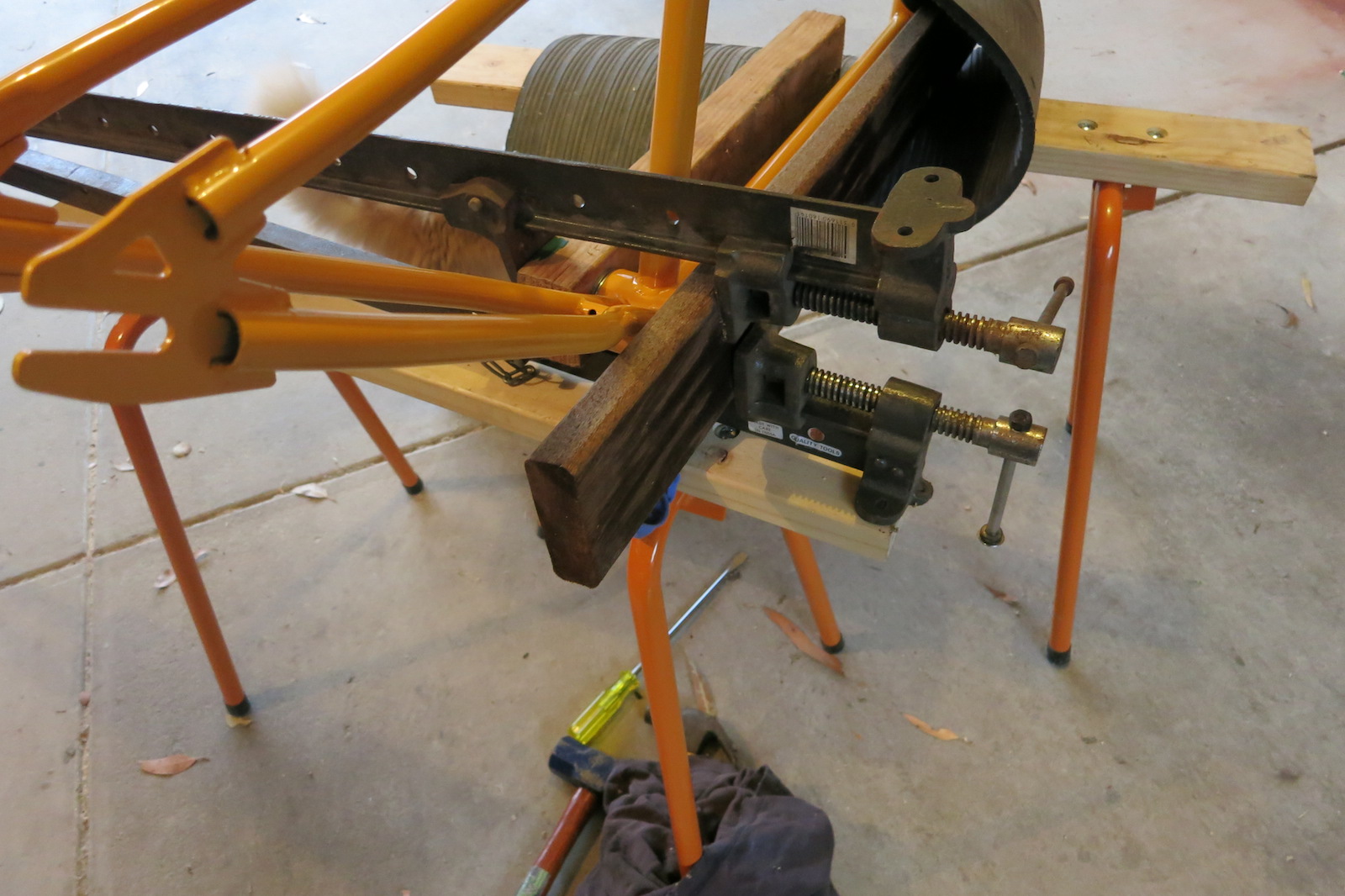 The cups for the bottom bracket can be fitted using sash clamps as well. I use two lengths of timber to protect the edges of the cups. These can be tricky to fit as the cups will tend to go in cocked especially if the clamping area of the sash is smaller than that of the cup 'face'. A second clamp fitted from above helps remedy this by allowing you to adjust each clamp separately.
