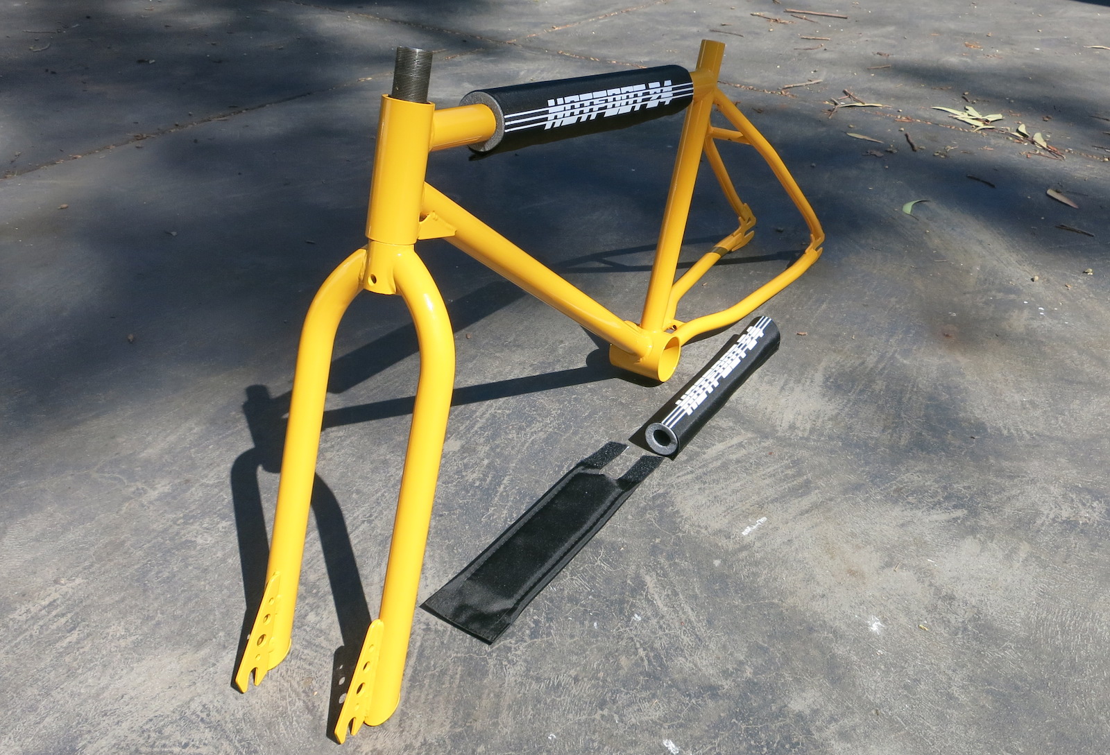 The bike I bought from Peat was basically original with decent chrome and my original plan was to simply polish the frame, replace the rusty wheels and ride it but I kept reflecting on the two bikes Clayton had built for himself and his brother. The bold colours of his yellow and orange bike set them apart from the common chrome / black accessories builds that are floating around. I had a plan - if this was going to be a cruiser it was going to stand out and it was going to be built for cruising. To make it stand out, I wanted a loud colour and BMXMadman suggested a colour called Hazard Yellow.
