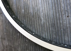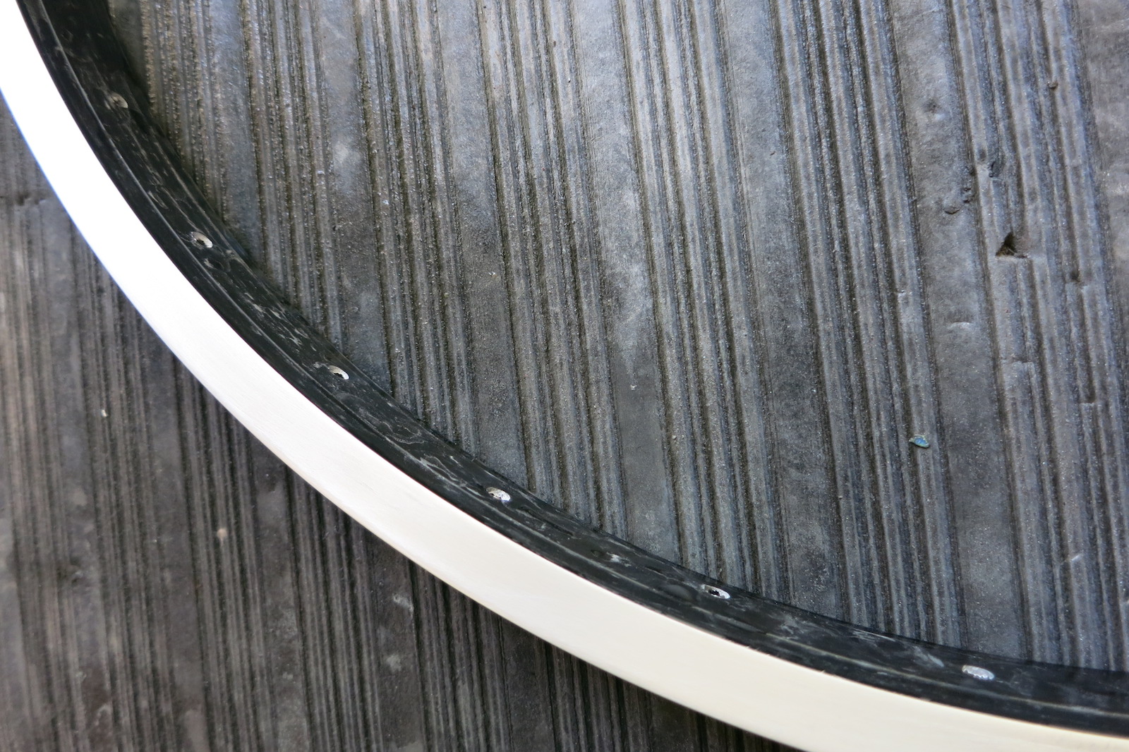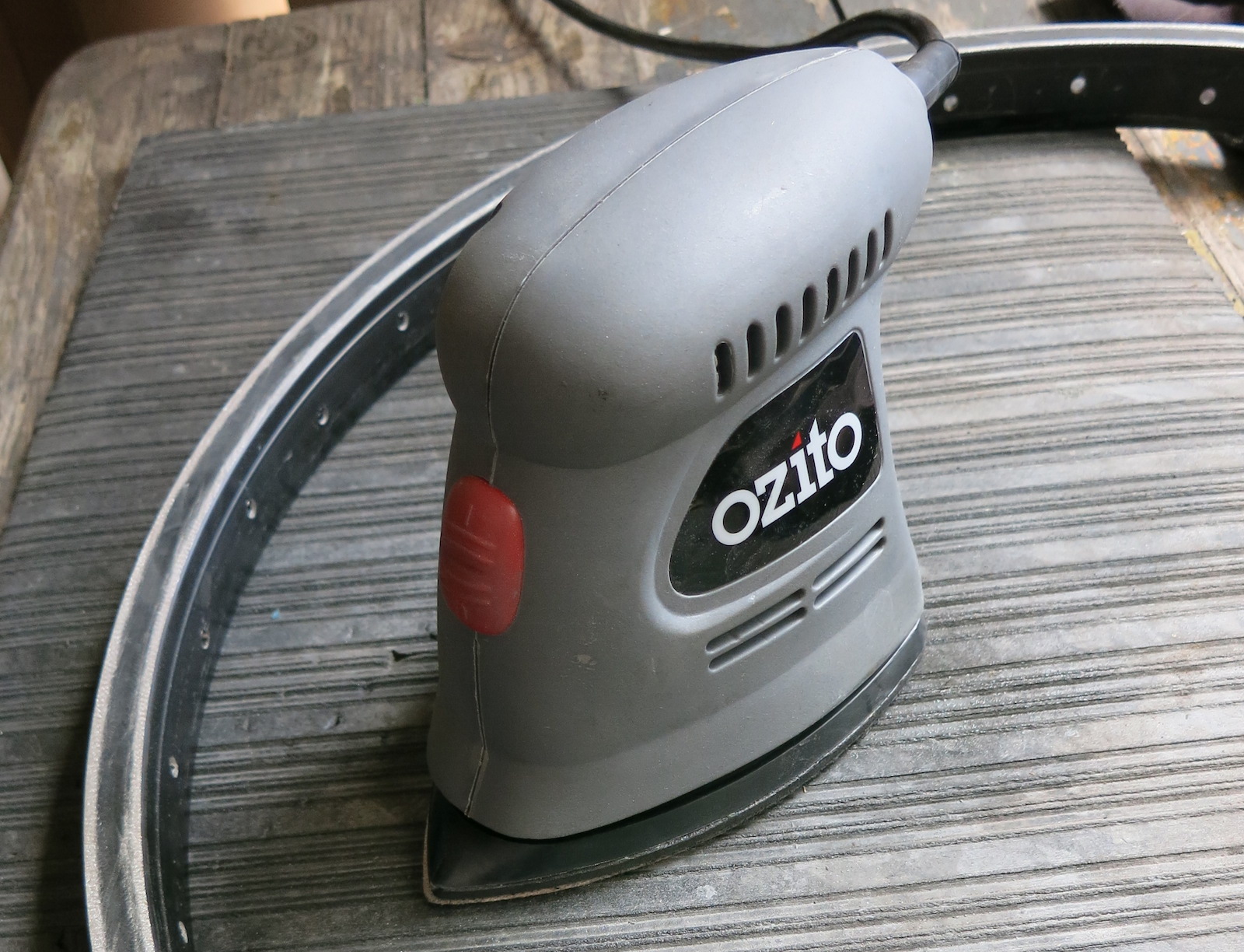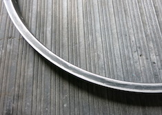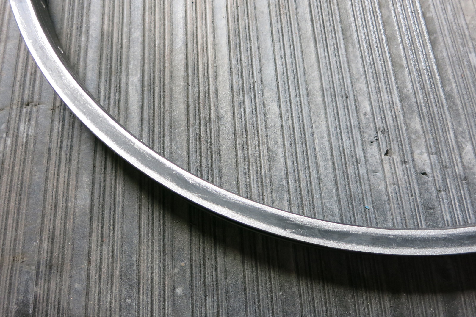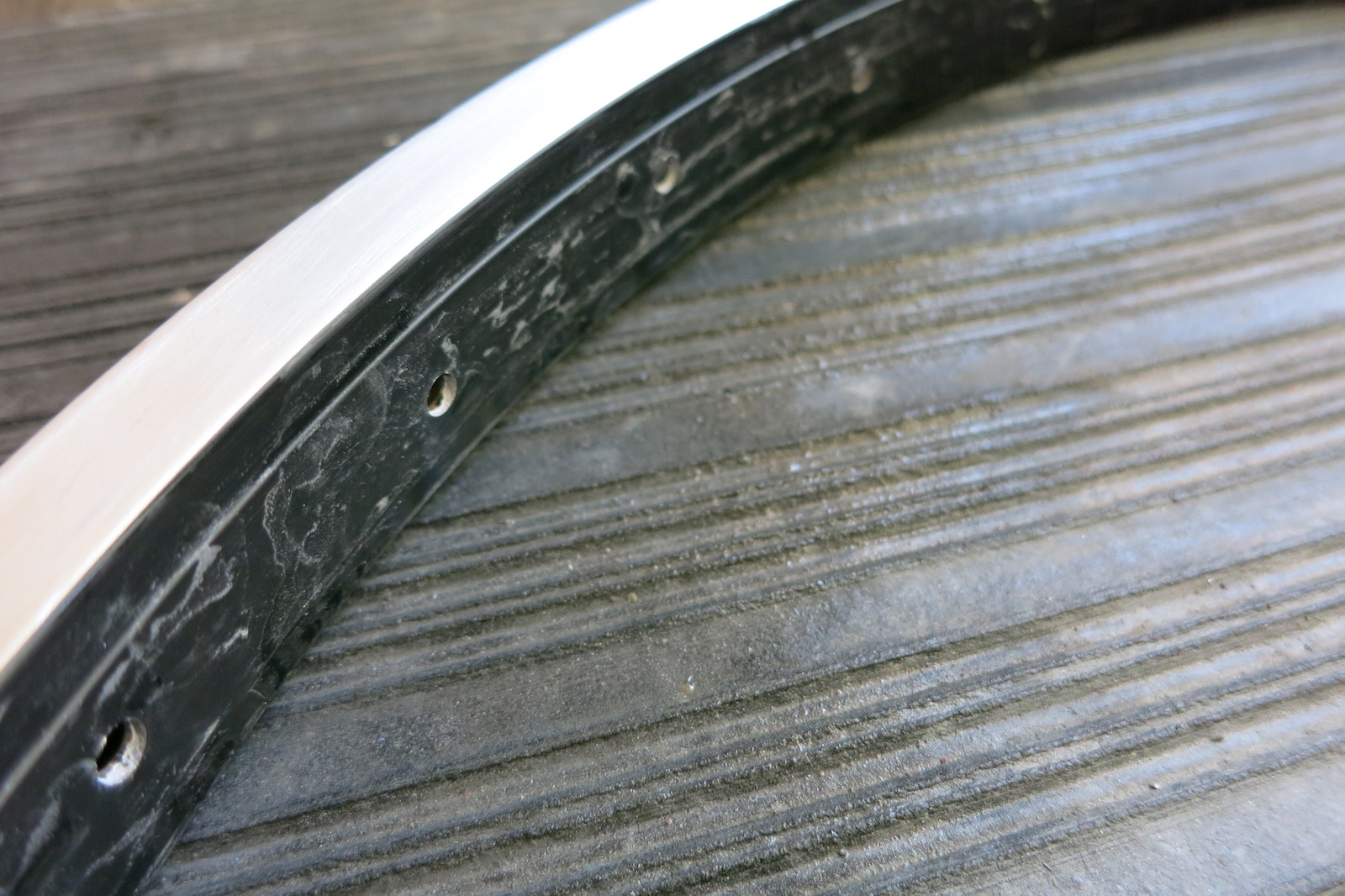 The rims were anodised black - boring - so I shiny-sided them by first stripping as much as I could using a cheap electrical sander and 80 grit sandpaper. As you can see theis took the anodisation of the edges of the brake face but left the middle untouched. This has been my experience every time I have shiny sided rims and assume that the rims have concave sides - or I am doing it wrong! I sanded the remaining anodisation off using wet 'n dry starting with 80 grit and working up to 1600 grit. A final polish with Purple Polish finished the rims ready for lacing.