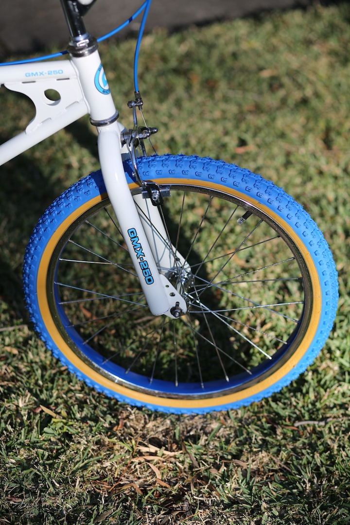 The Giant GMX-250 frame was purchased in pre-sand blasted and primed condition, however it had been sitting around for a while and needed to be sanded back and re-primed before spray bombing white. The forks and chain wheel from the Repco Hotfoot and MX CW style handlebars from the Phoenix BMX were also spray bombed in matching white. The Repco Hotfoot cranks, bottom bracket, stem, headset, seat and pedals along with front and back brakes and layback seat post all came from the Phoenix BMX. All donor parts were cleaned, polished and re-greased.