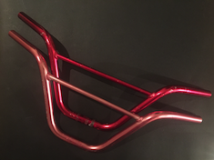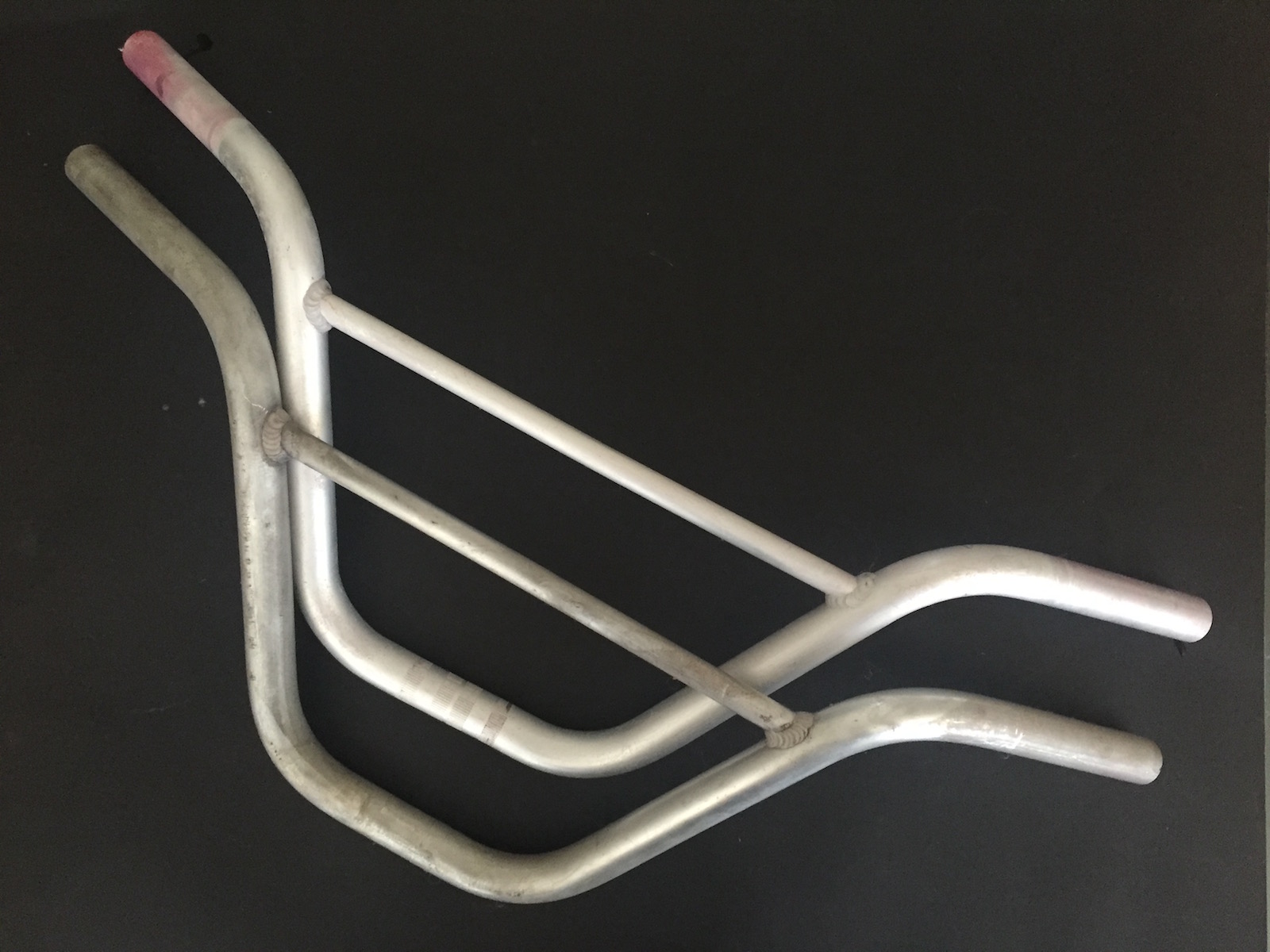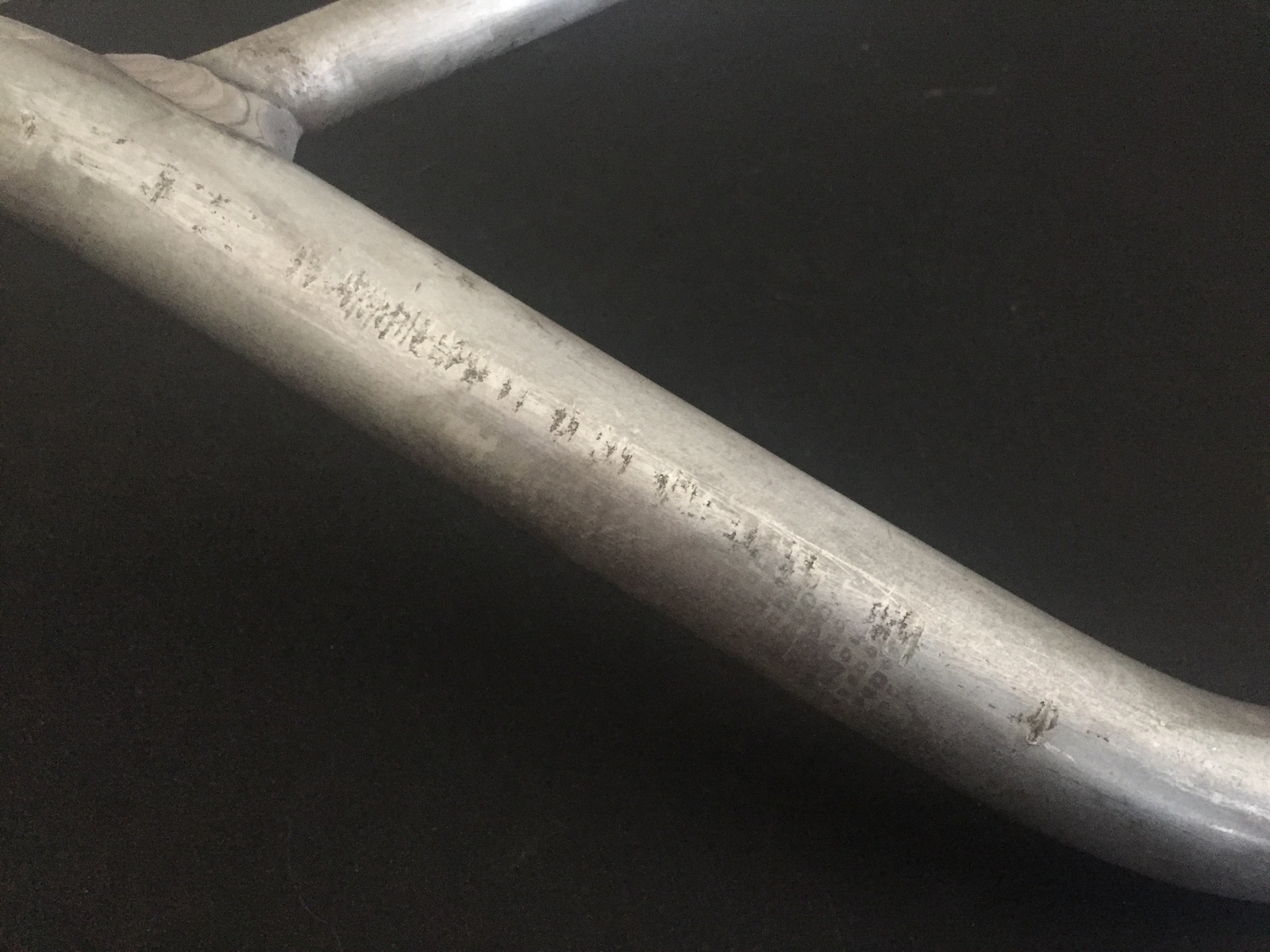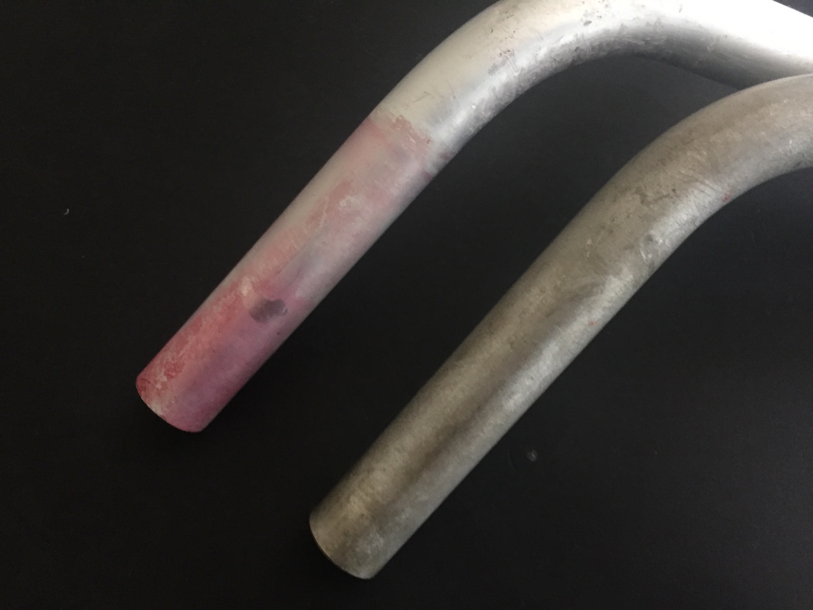 The pics below show the bars before and after the stripping. The red was hard to get off both sets of bars even with me agitating the surface regularly with a toothbrush. and I ended up stopping the process early before to much damage was done to the raw alloy but at the same time leaving some colour on the bar ends and in various spots where it had obviously penetrated the metal more.