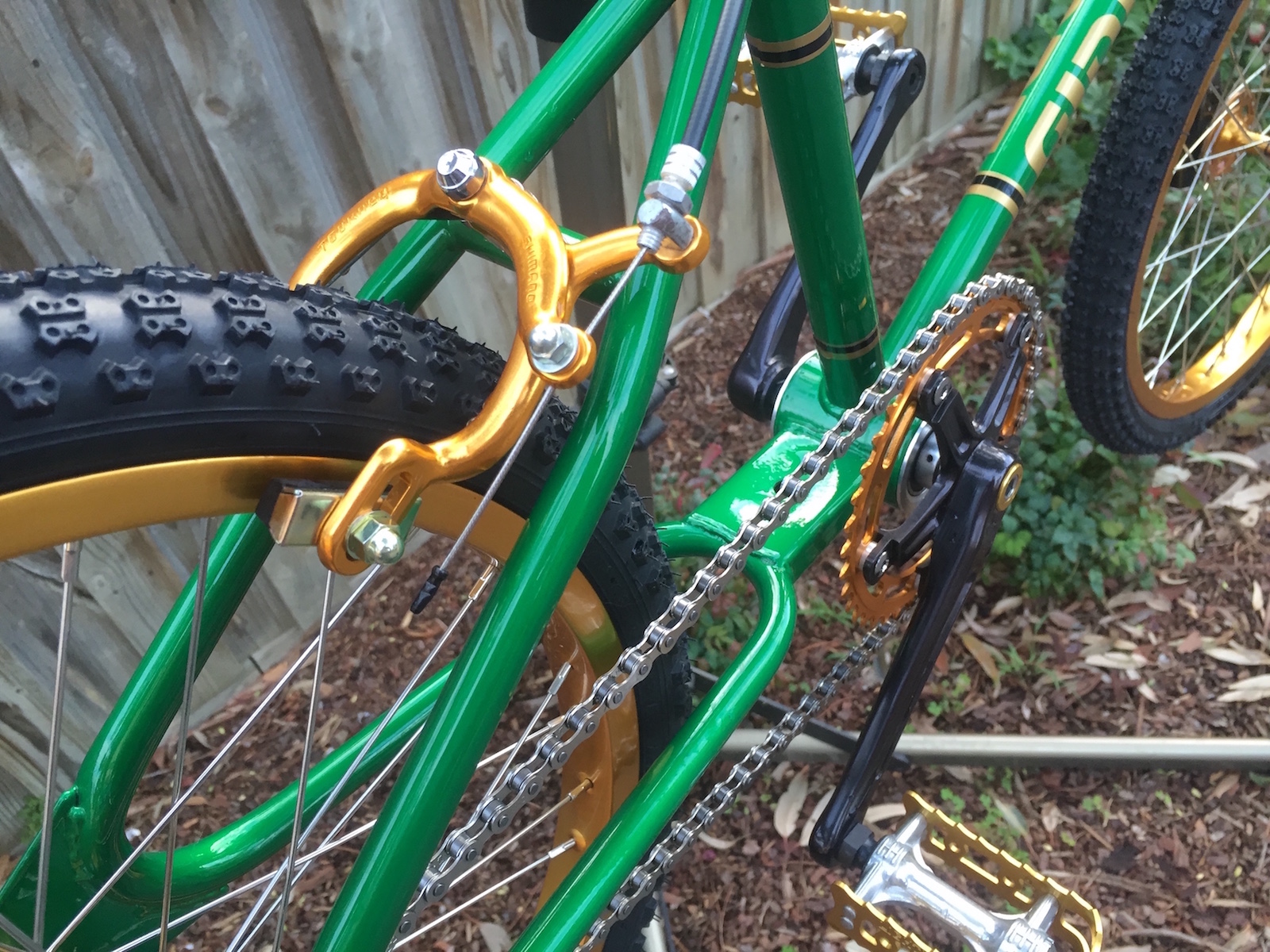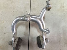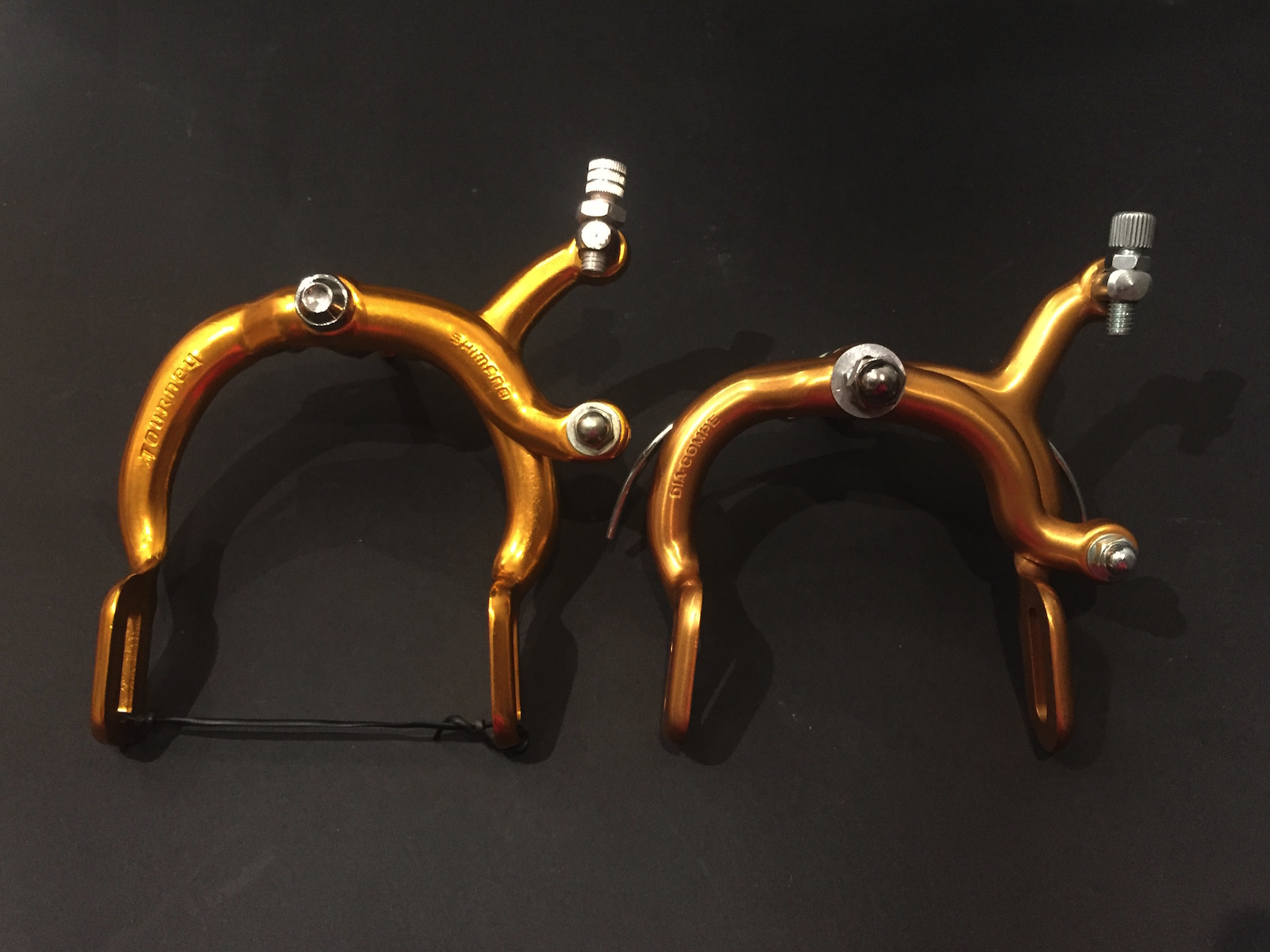 However, after reassembling it I test fitted it to the bike and realised it simply would not have enough 'reach' to sit properly on the rims of the rear wheel. At about this time I saw a set of mint Tourneys on OzBMX and bought these instead. You can see from the pictures below just how much larger the Tourneys are compared with the 890s. In retrospect, the bike was destined to have a lot of Shimano / Takagi parts - cranks, chain ring and brake lever - so maybe the Tourney was a better suit overall.