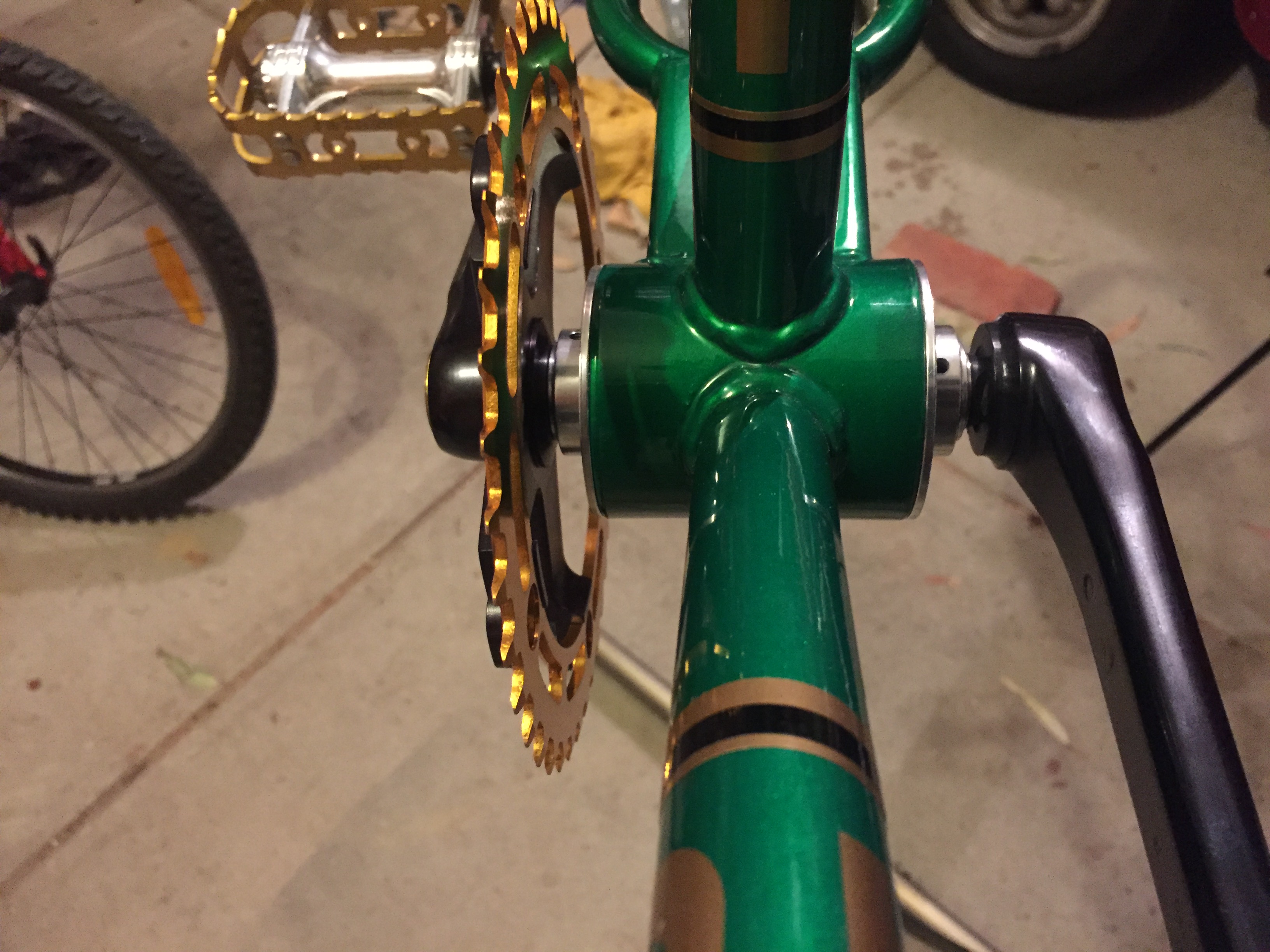 My second issue was that the cranks would not sit correctly on the spindle resulting in them sitting further away from the centerline and in turn making the whole set up look very wide and the chain line not lining up correctly. I determined that this was due to the chamfered edges of the spindle and I managed to grind the shoulders of this and then the spindle bottomed out on the back of the cranks. This brought the cranks back in towards the frame but the chain ring and freewheel line still did not line up exactly. Bearing in mind that the Shimano cranks were originally designed for a road bike, I cut my losses and bought some 2.5mm chain ring spacers to fix the problem.