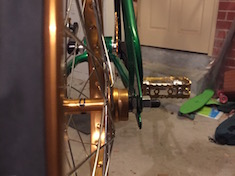 My final issue was the spacing on the forks was a little too narrow for the Shimano hubs on my shiny, new wheel set by 3 or 4mm. I didn't have the strength to splay them with one hand while inserting the wheel with the other so I built a little tool to spread the forks ever so slightly and hoped it would spring back to a slightly wider track. Unfortunately, this didn't work so I had my wife help fit the wheel while I splayed the forks manually. Unfortunately, this too did not work and I resorted to taking the cone lock nuts off the hubs. This did work.