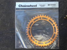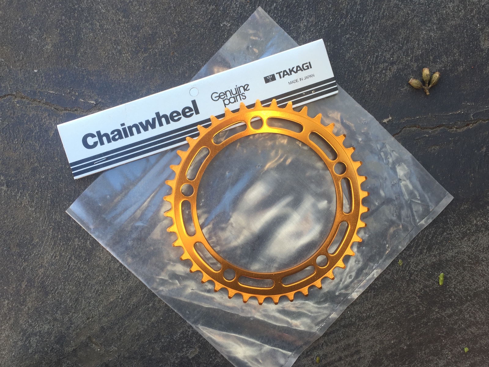With the frame and accessories colours already decided for me, the collection for gold parts was on in ernest. Shimano parts were the obvious choice to match the 600 cranks that Benny was preparing and soon I had the NOS chain ring, DX lever and a Takagi chain ring guard. Not many people realise that Takagi was purchased by Shimano in the early 80s and thus it is in fitting with the Shimano theme.