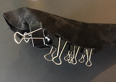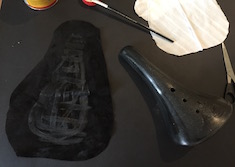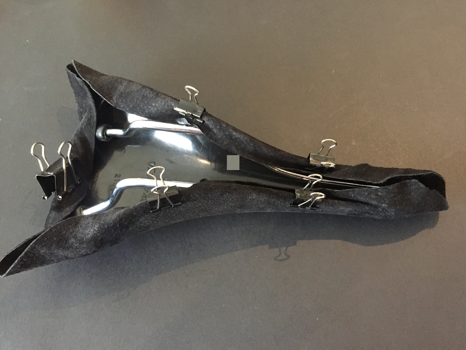 Taking it slowly, I glued the edges down moving from the sides to the back. I would tackle an inch at a time, planning where I wanted the skin to sit - due to the shape of the seat, you are always trying to gather the suede back towards the sides and away from the curves. The suede will stretch a little and 'scrunch' up nicely and assume the shape you squish it in. Once, happy I glued the area and placed bulldog clips on the area to prevent the skin from moving.