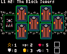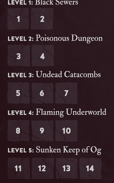 Each level in the dungeon has a number of areas and each area has a number of rooms. The rooms are represented by 7 cards and are dealt randomly on each level. You must progress through the rooms before delving to the next area. When completing the last area of a level, you will fight a Boss monster and be rewarded handsomely if you win.