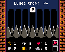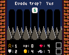 | • | Spring Blades | You walked on a pressure plate and jumped just in time to avoid losing your head. Lose 1 HP. |
