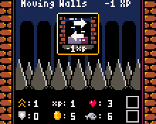 | • | Moving Walls | Moving walls were about to crush you, but you sacrificed your sword to save yourself. Lose 1 XP. |