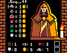 Scroll through the available choices using the Up and Down Buttons. Commit to a transaction by pressing the A Button. Toggle between buying and selling by pressing the Left and Right Buttons. When complete, press the B Button to return to the dungeon.