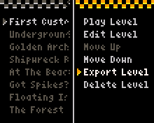 Select a level by pressing the A button to reveal the sub-menu of options. As shown in the image below, you can edit the level, move it higher or lower in the list and even delete it. You can also test the level as you develop it to make sure its both complete and fun! Pressing B will return you to your previous selection.
