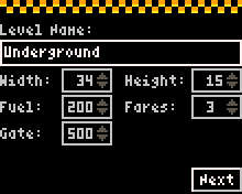 Editing a level will present you with details of the level itself - including its height, width and number of fares that need to be collected before progressing to the next level. The Fuel setting details how much fuel the player starts with and the Gate setting specifies how long internal gates remain open when switched on or off.