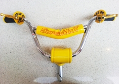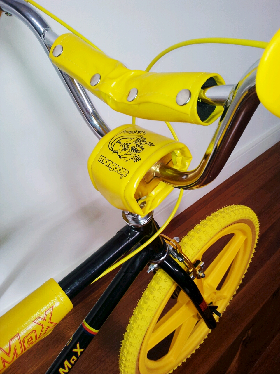 The pads on Nicole's bike have always intrigued me. Firstly, the set is obviously for a handlebar with a straight cross-bar rather than 'V' bars on her bike and - secondly - to my knowledge Malvern Star SuperMaxes never had stem pads yet this bike has one. In the last photo, Trent has been able to identify the stem pad as a Mongoose one! Both Maurice and the Mongoose logo are visible in the picture.