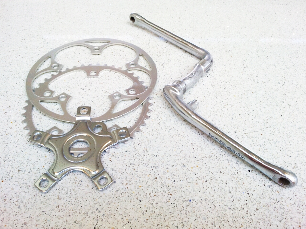 SuperMaxes came with either Takagi Tourney 3pc cranks or a Takagi 1pc crank. Most one piece cranks featured the large alloy chainguard as seen here but Trent was able to identify that Nicole's bike used the light-weight chainring that was fitted to some models, such as the Malvern Star SuperMax Turbo. Read the Malvern Star Turbo review from Pancake magazine here.