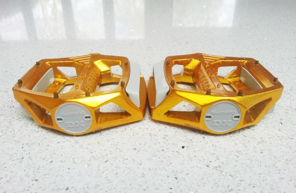 To some, Shimano DX pedals are the best '80s pedals available and the price these attract reflect that belief and their scarcity. Finding a set of NOS Shimano DX pedals in Gold was always going to be difficult but to find a set in 1/2" rather than the more common 9/16" would seem near impossible. After missing out on a set in the UK, Trent found a set in the US and mortgaged his house to buy this set. When they arrived, they were still in the original packaging and had very little shelf-ware.